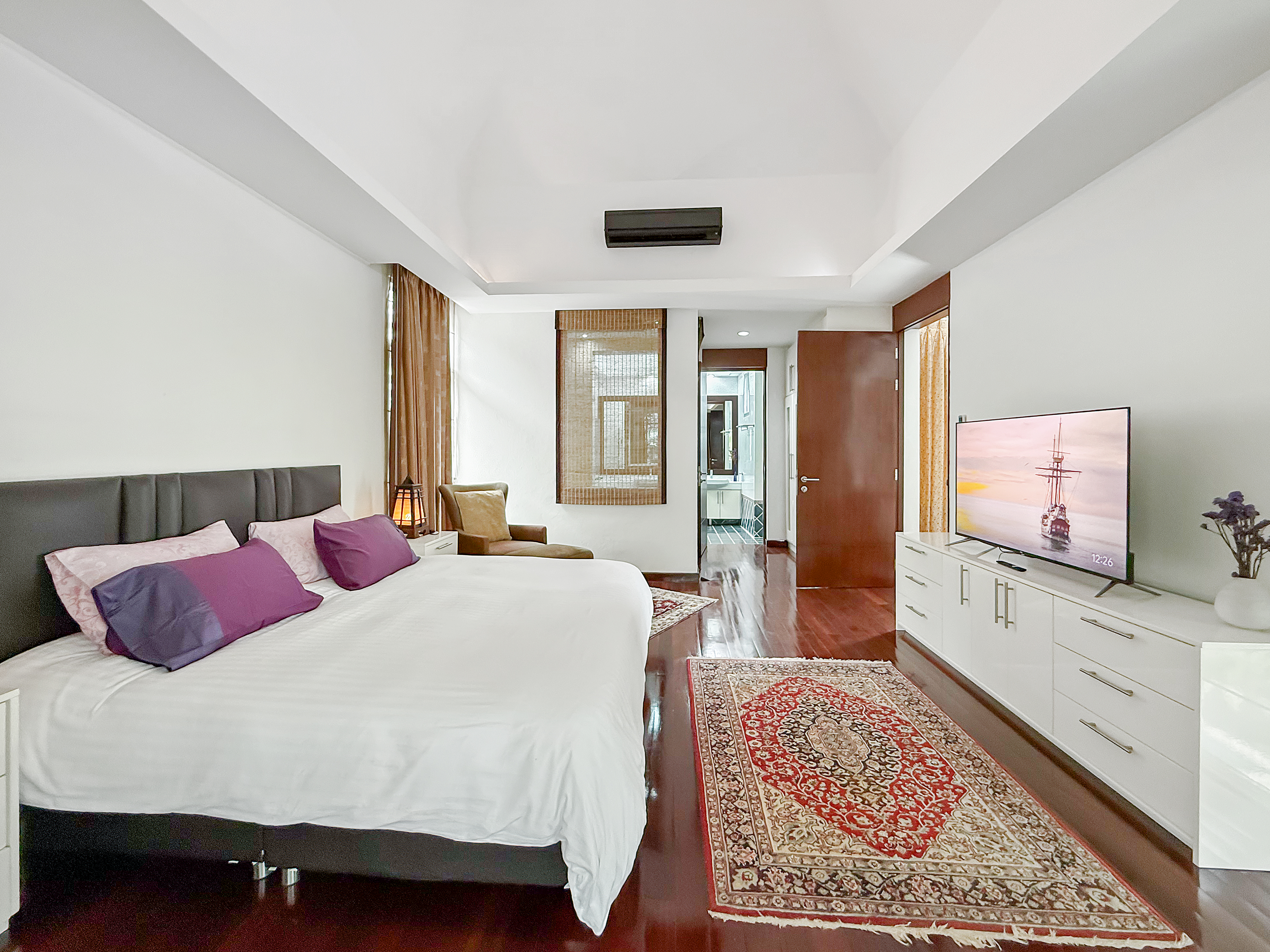 The master suite features its own private lounge area, spacious bathroom with Jacuzzi, and direct access to the terrace and pool area. All bedrooms are generously sized and come with en-suite bathrooms, hardwood floors, and quality furnishings.