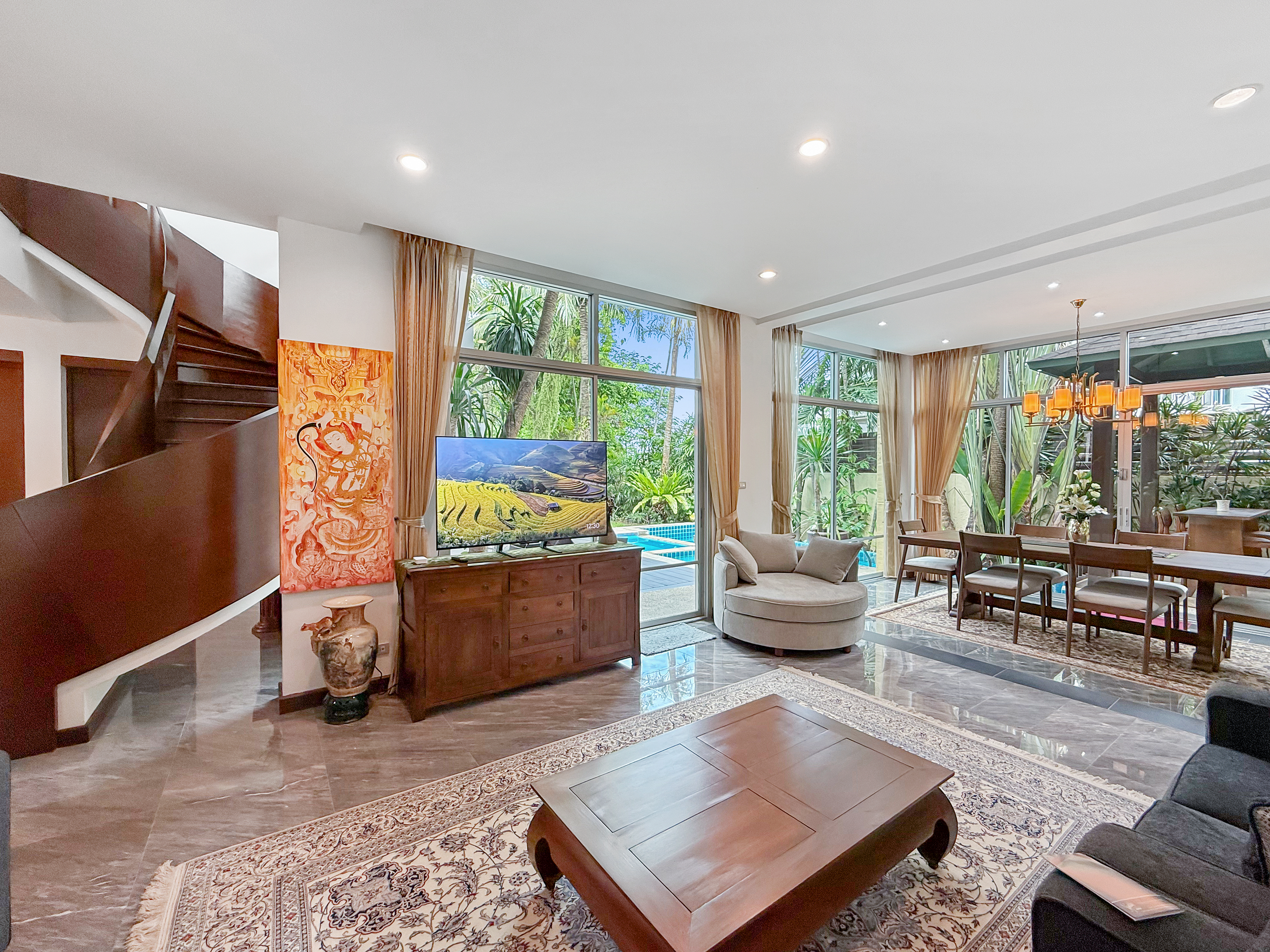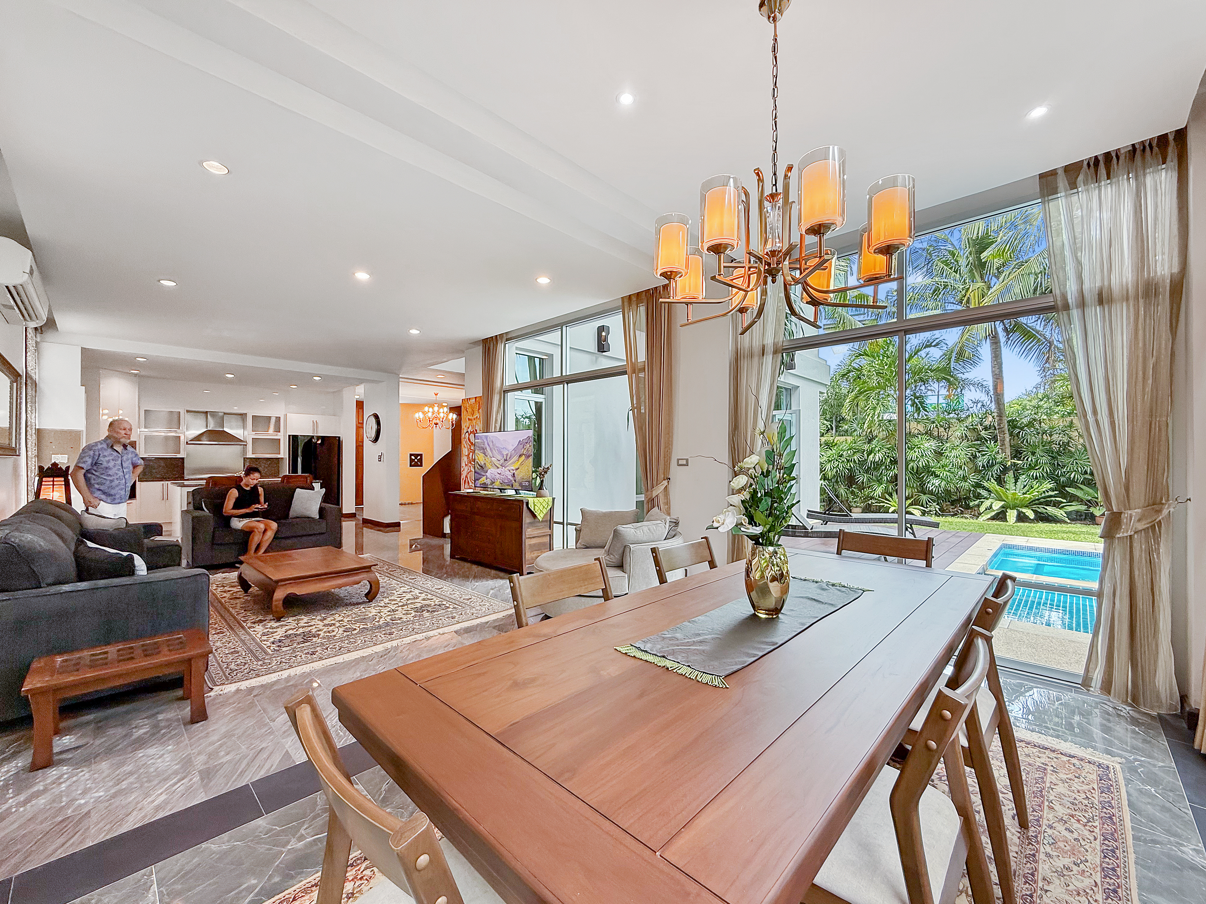 Set on a 488 sqm land plot with 360 sqm of living space, this home offers a welcoming atmosphere with a grand open-plan living and dining area surrounded by large glass panels that fill the house with natural light and overlook the tropical garden and private swimming pool.