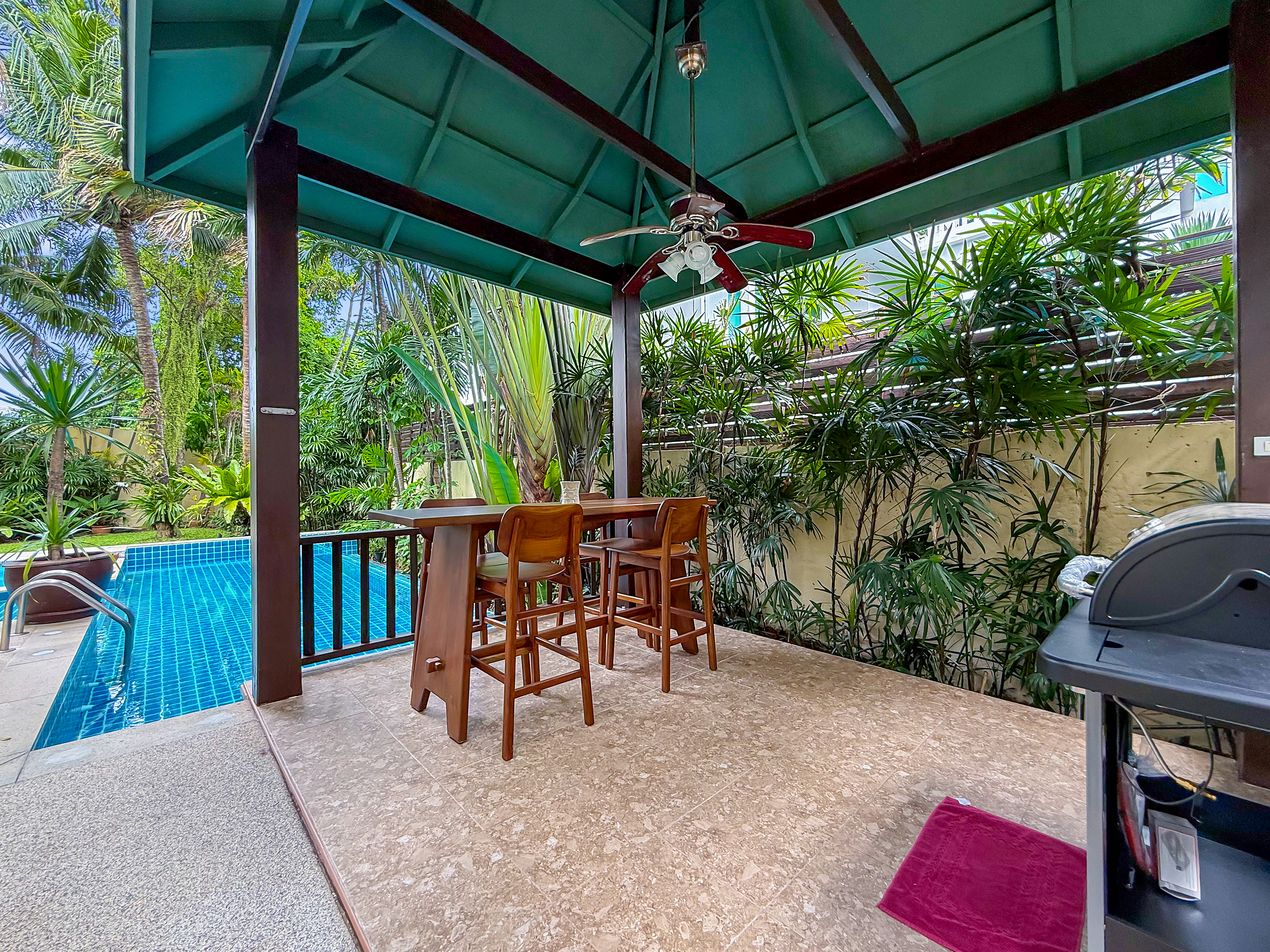 This stunning 4-bedroom, 5-bathroom pool villa is located in the prestigious Nagawari Village in Na Jomtien, just a few hundred meters from the beach. The villa has recently been beautifully renovated and showcases exceptional craftsmanship with a perfect blend of modern comfort and natural materials.