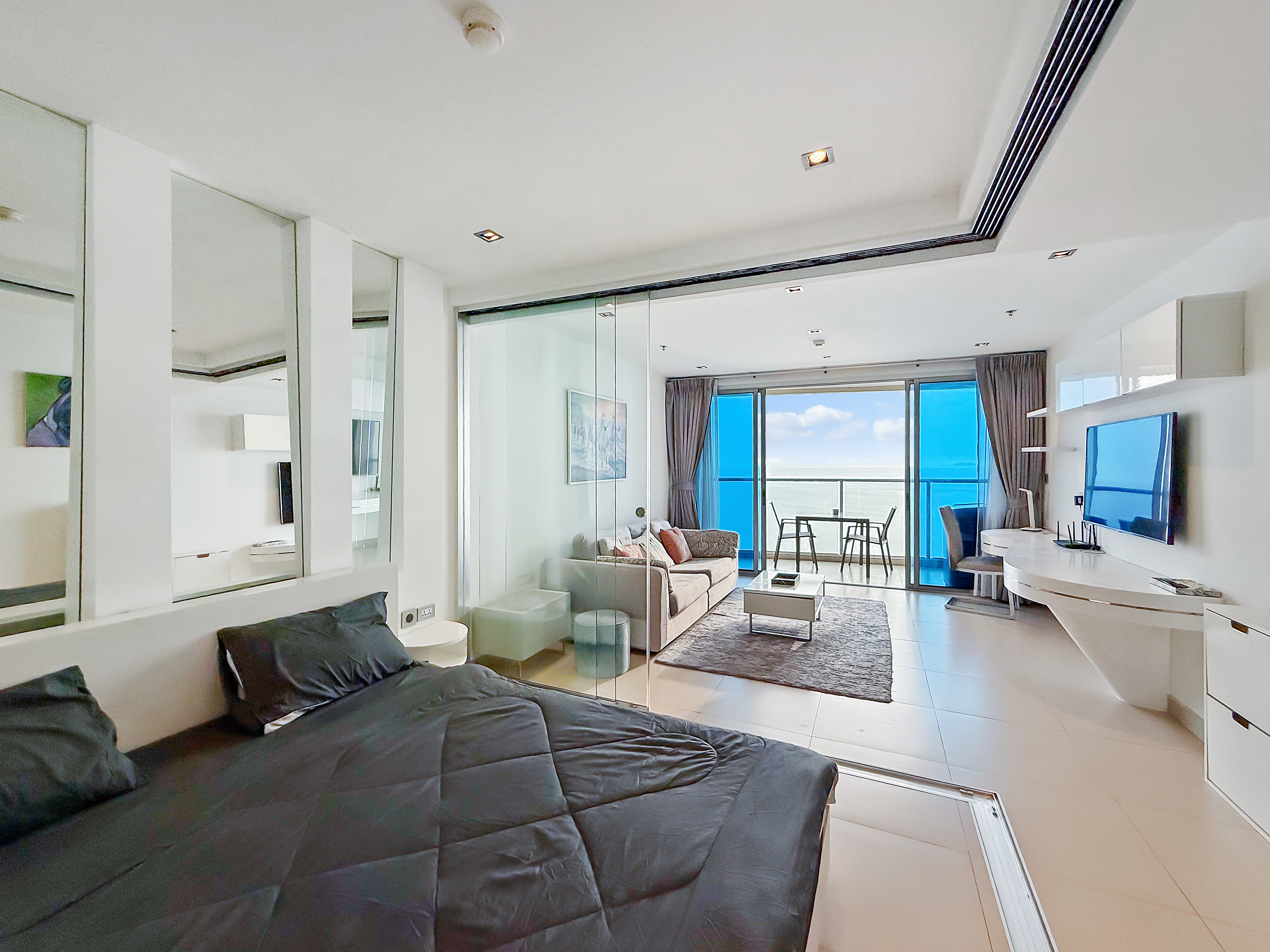 This high-floor 1-bedroom condo in Sands Condominium offers a peaceful living experience with a completely open sea view and a clear line of sight toward Koh Larn. The 52.5 sqm layout includes a bright living area, a sliding-glass bedroom, and a balcony positioned to take full advantage of the ocean panorama.