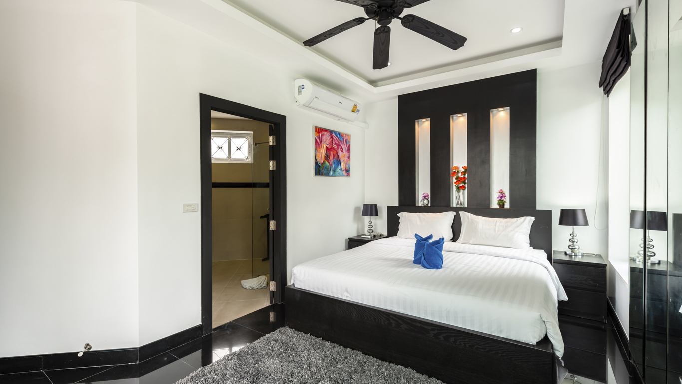 The black and white Scandinavian kitchen is fully equipped with a dishwasher, large fridge, cooking island, and everything you need. Next to the dining area is an entertainment area with one of a total of 7 flat-screen Smart TVs in the villa and with 300+ international TV channels, DVD-player, DVD collection, and a sound system. Outside the villa is a large, colorful infinity swimming pool, outdoor shower, BBQ corner, lounge area in the shade, sunbathing area, separate laundry room, etc.
