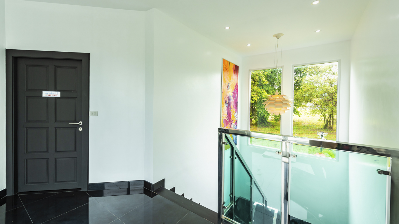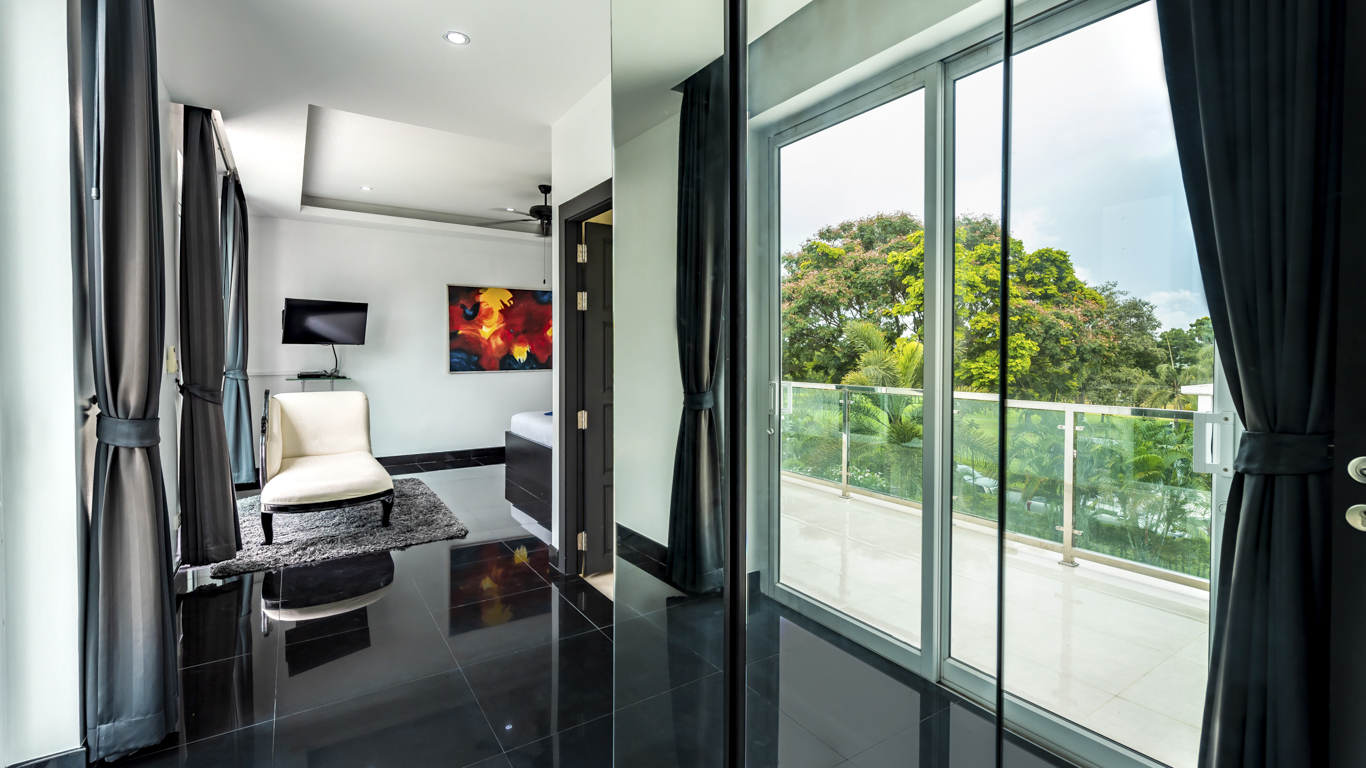 Everything is surrounded by a tropical garden and a double car park with a remote-controlled access gate. The villa is secured with infrared and high-definition cameras, motion censors all around the property, and a high-end alarm system with sensors on all doors and windows. The villa is safely located inside the Phoenix Golf & Country Club and access is restricted and controlled by security at the entrance gate.