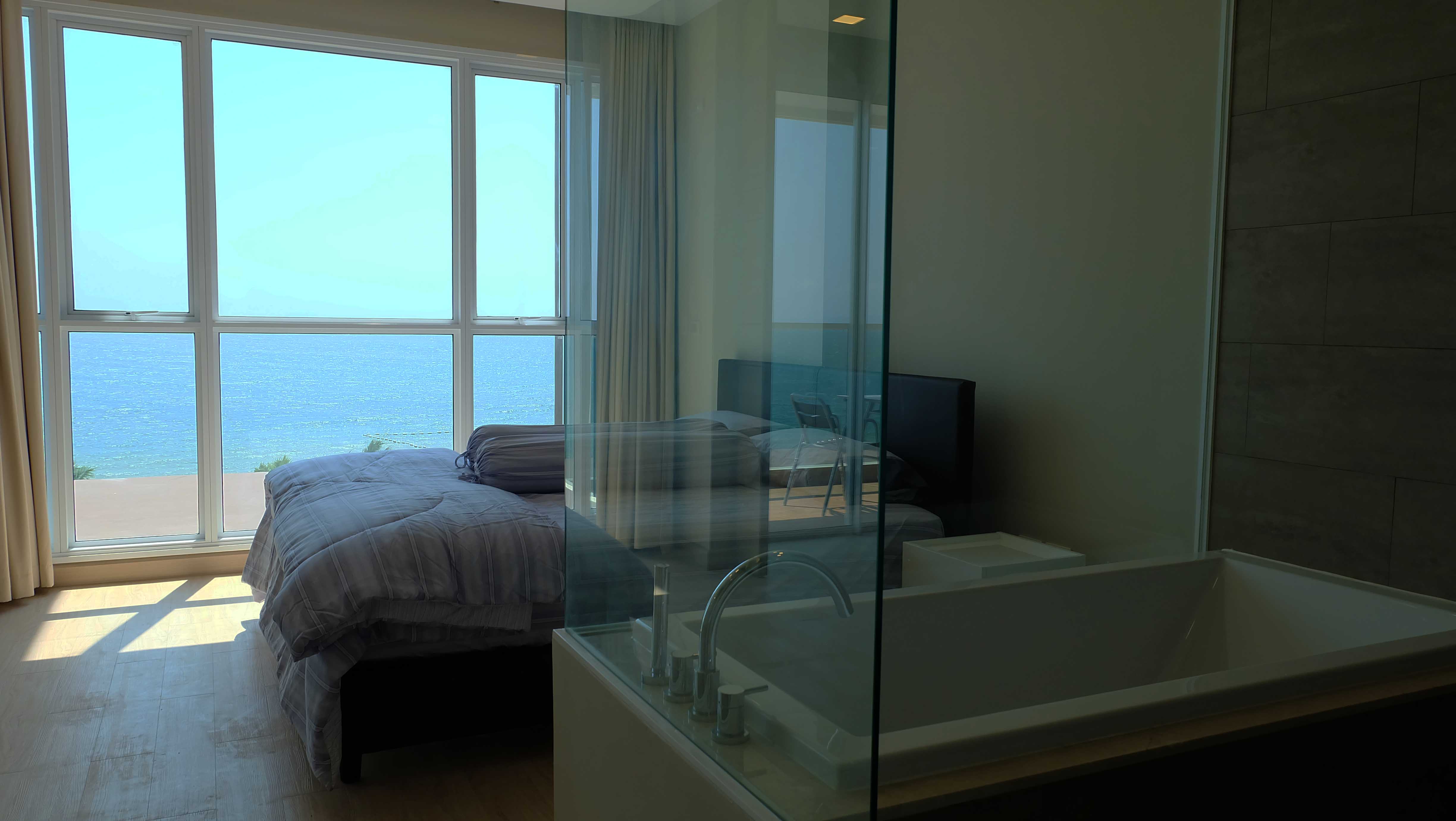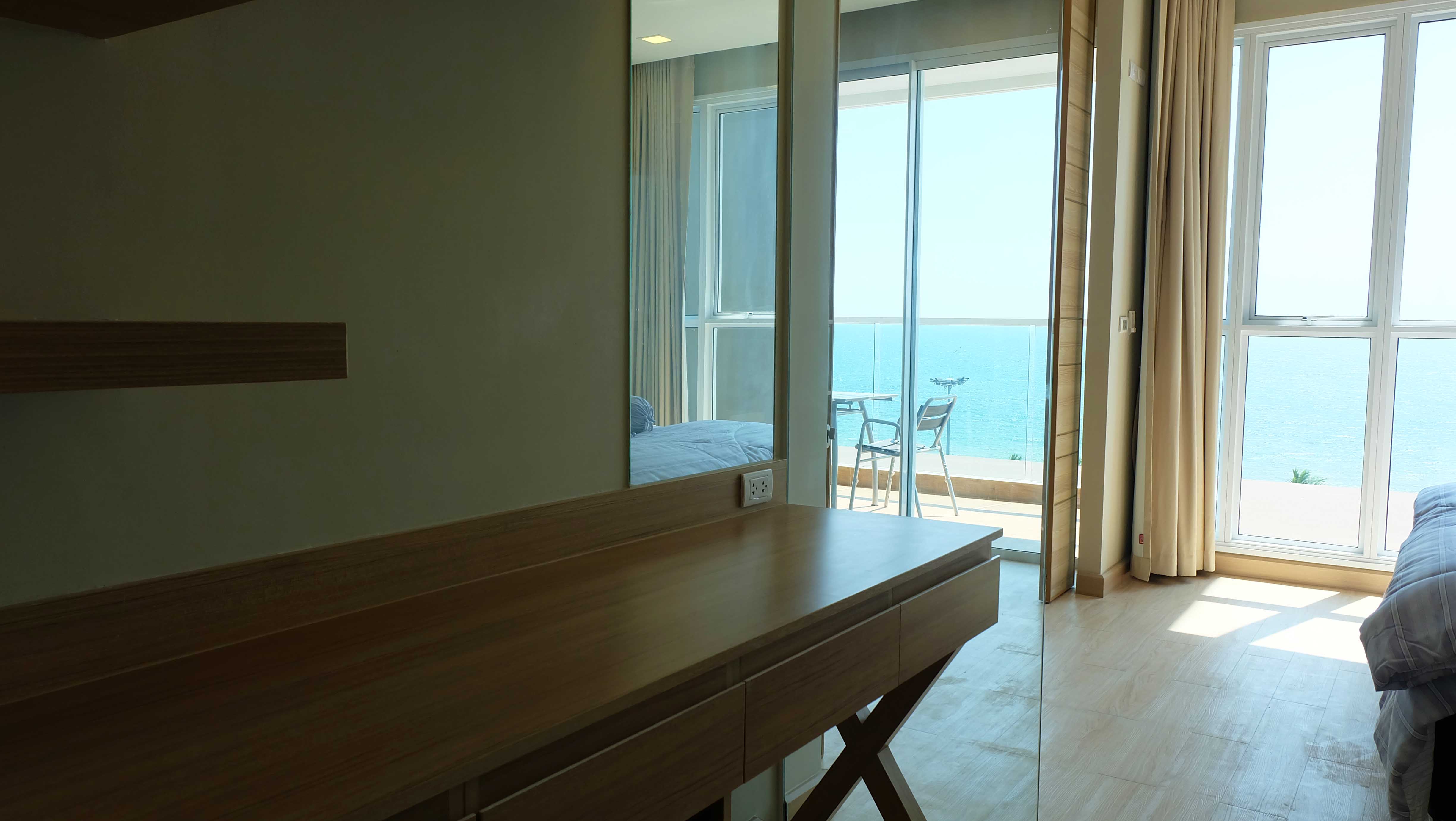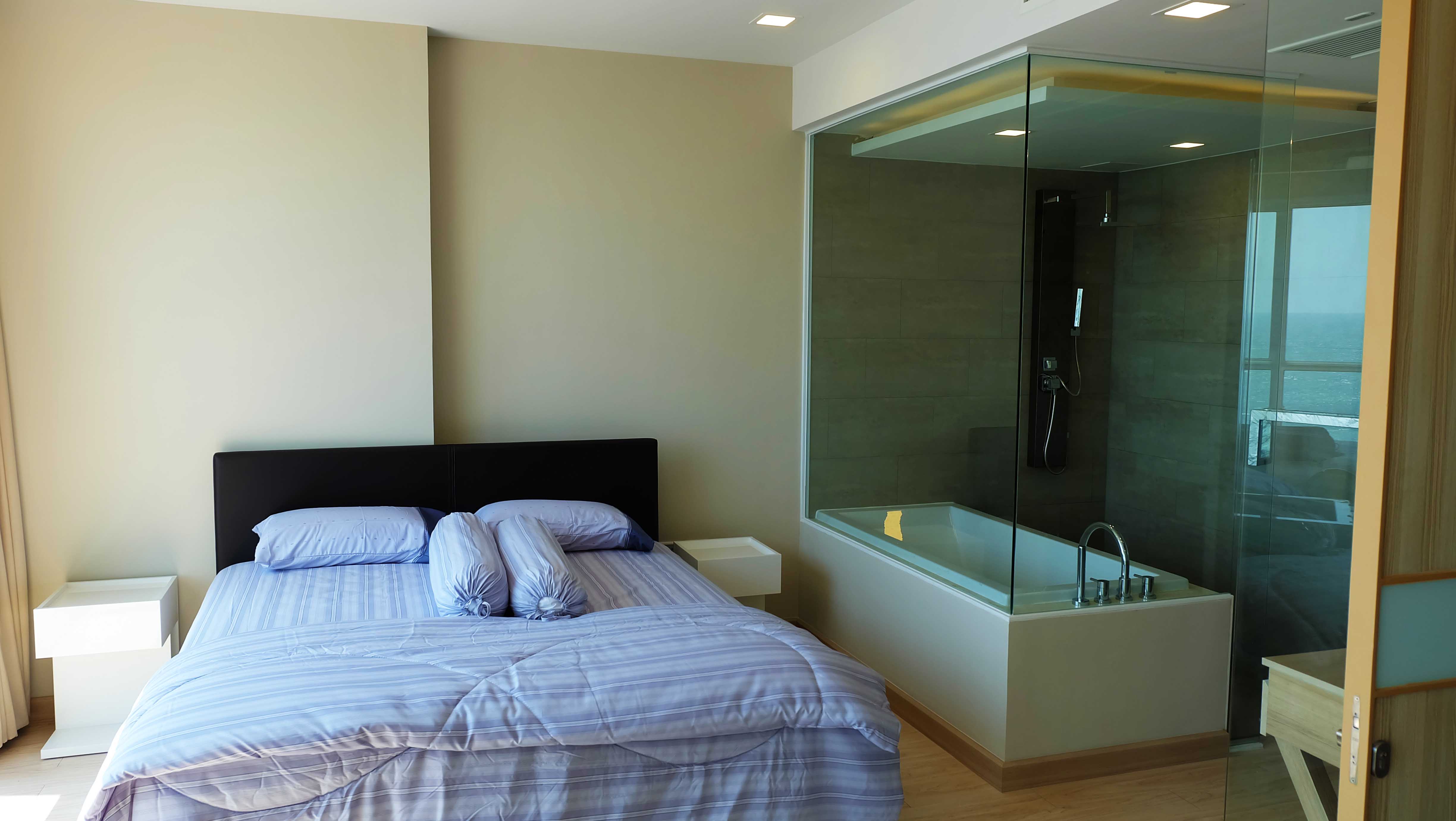 Modern beachfront condo for rent in Cetus which is located in Jomtien, Pattaya. This beachfront condo is fully furnished and has a great ocean view, high ceilings, and a modern design. The living area and the bedroom are separated by a sliding door which gives you the impression of a much large condo. The condo has a large balcony which is ideal for enjoying the beautiful sunsets.