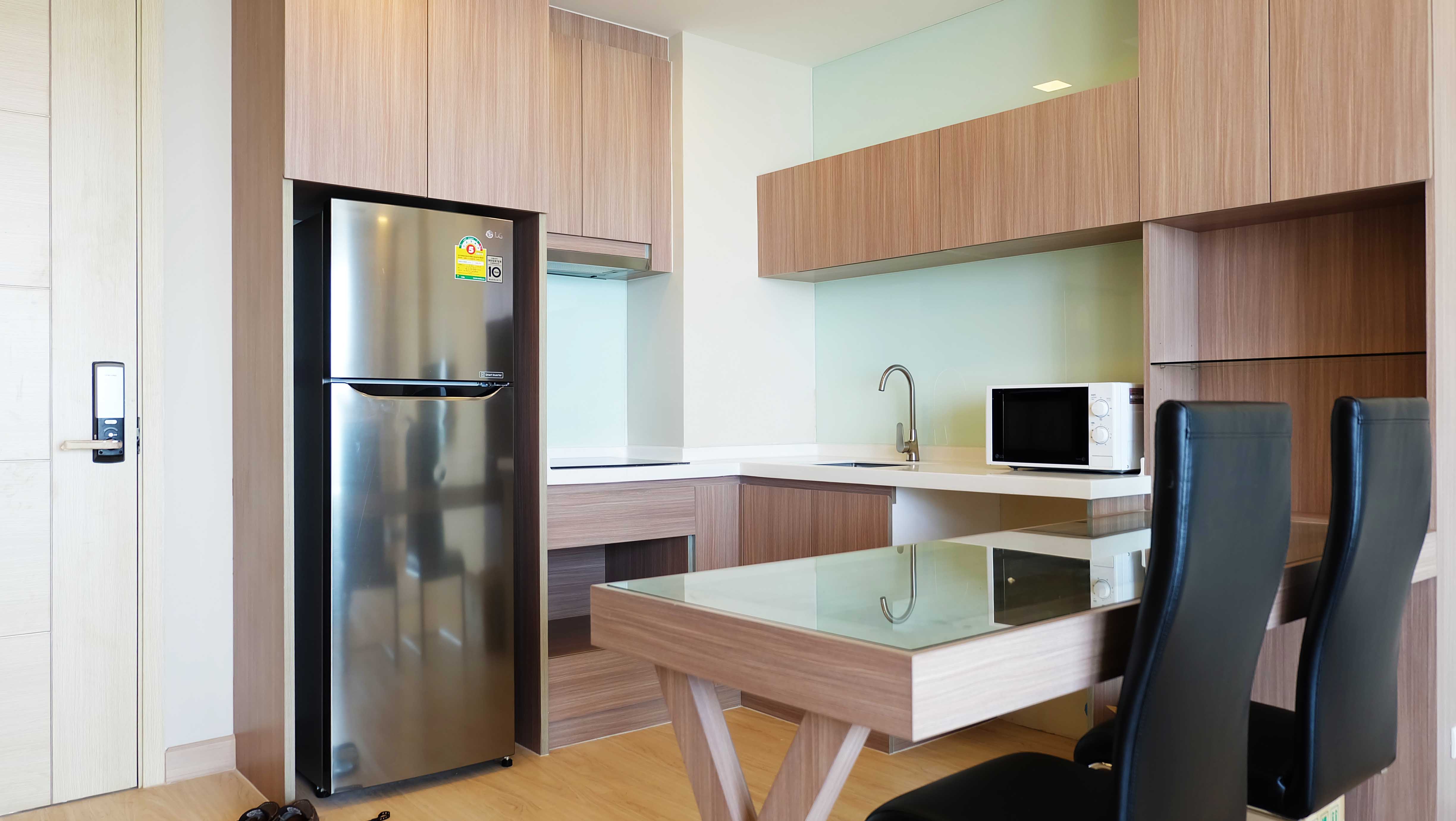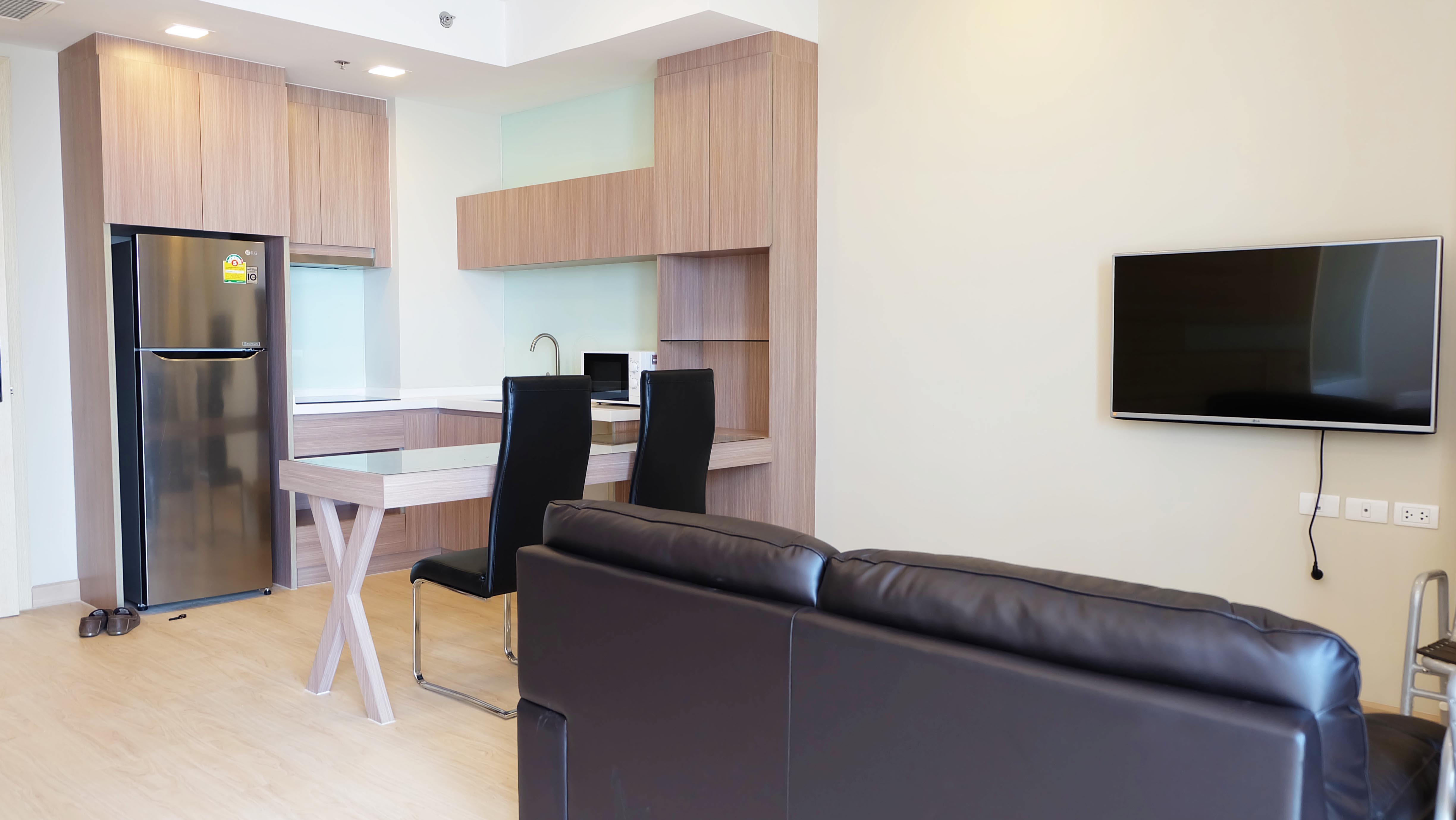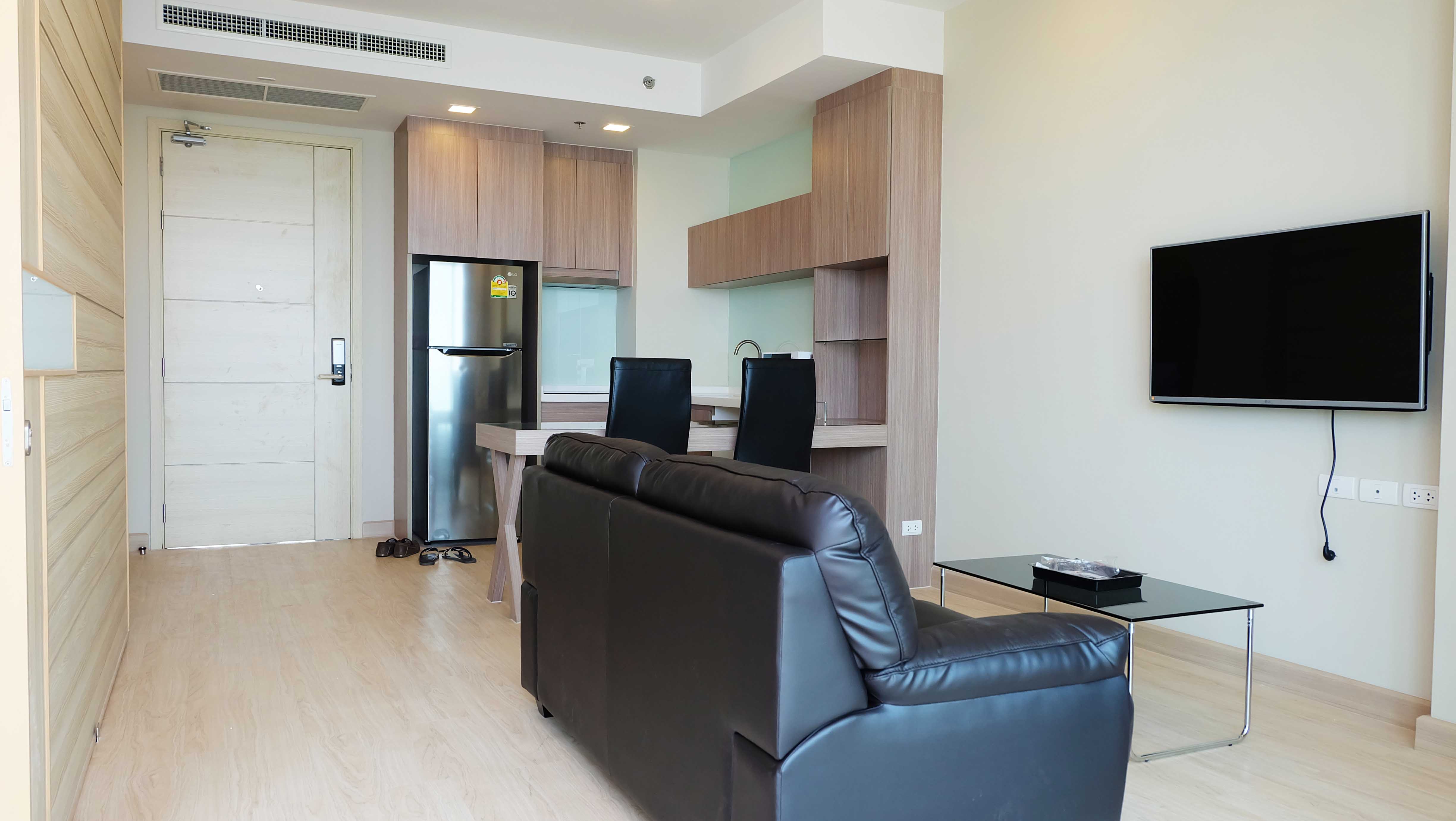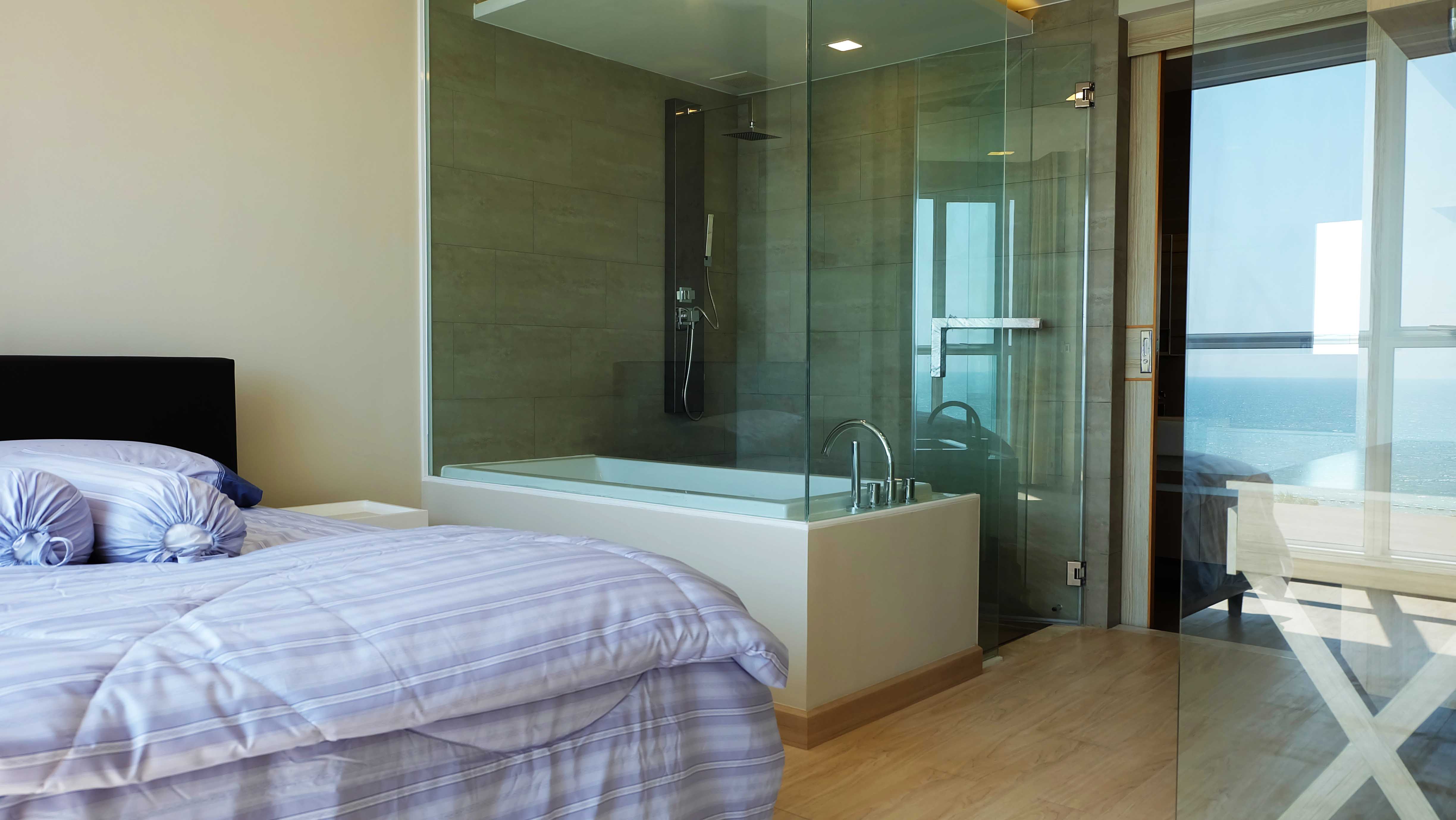 Modern beachfront condo for rent in Cetus which is located in Jomtien, Pattaya. This beachfront condo is fully furnished and has a great ocean view, high ceilings, and a modern design. The living area and the bedroom are separated by a sliding door which gives you the impression of a much large condo. The condo has a large balcony which is ideal for enjoying the beautiful sunsets.