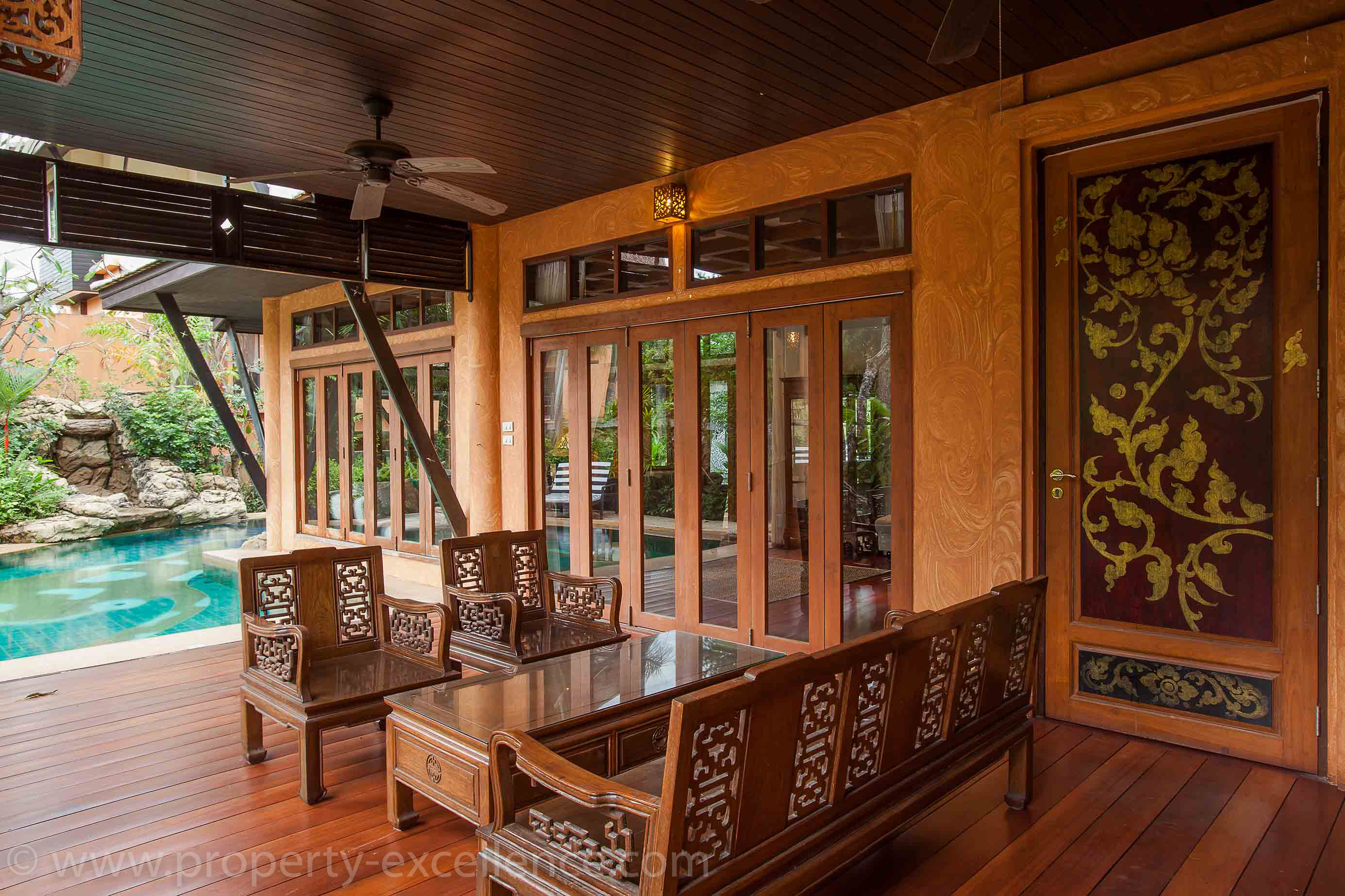Dharawadi Pattaya 4-bedroom pool villa for rent at just 95,000 THB per month. This 4-bedroom 4.5-bathroom pool villa is rented fully furnished. There is beautiful woodwork throughout the house and all 4 bedrooms are large and have en-suite bathrooms. On the ground floor, you have a large European-style kitchen, separate dining area, a bedroom, and a large living room with access to a terrace and pool area. On the second floor, you have 2 large bedrooms and on the 3rd floor the master suite. The house has a double garage and separate maid quarters. The land size is 484 sqm and the total living area is approximately 700 sqm whereof 480 sqm are indoor.