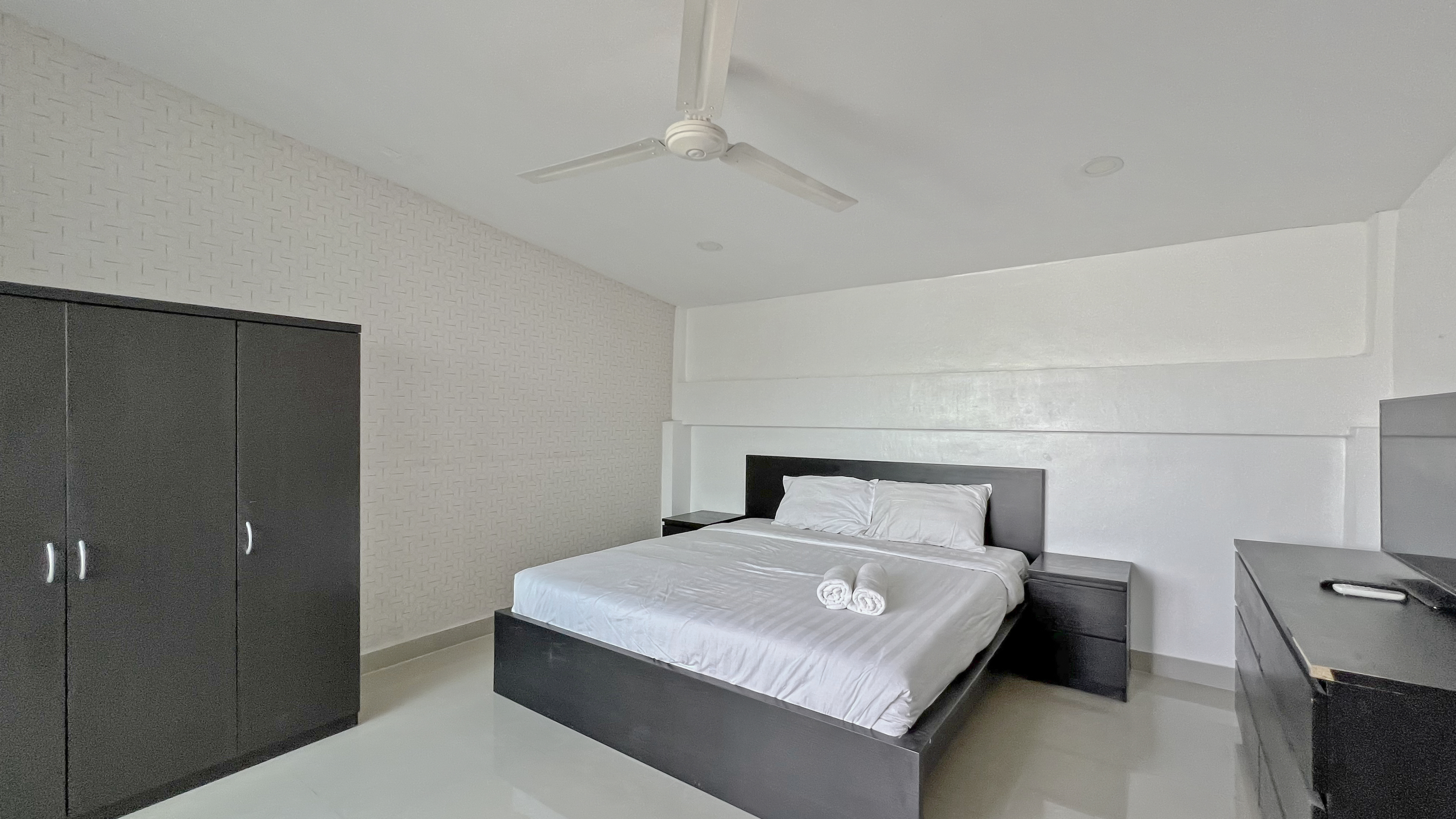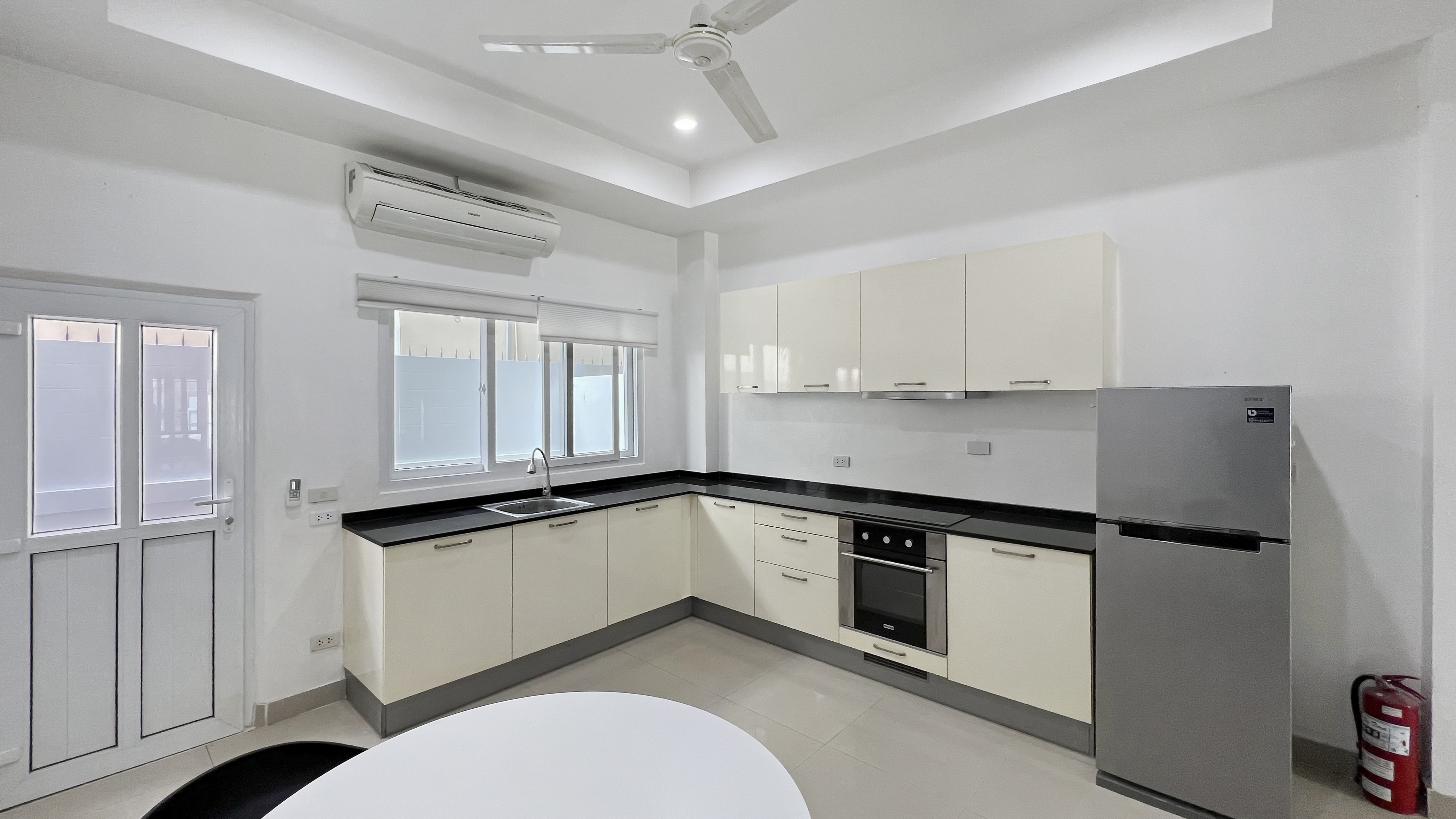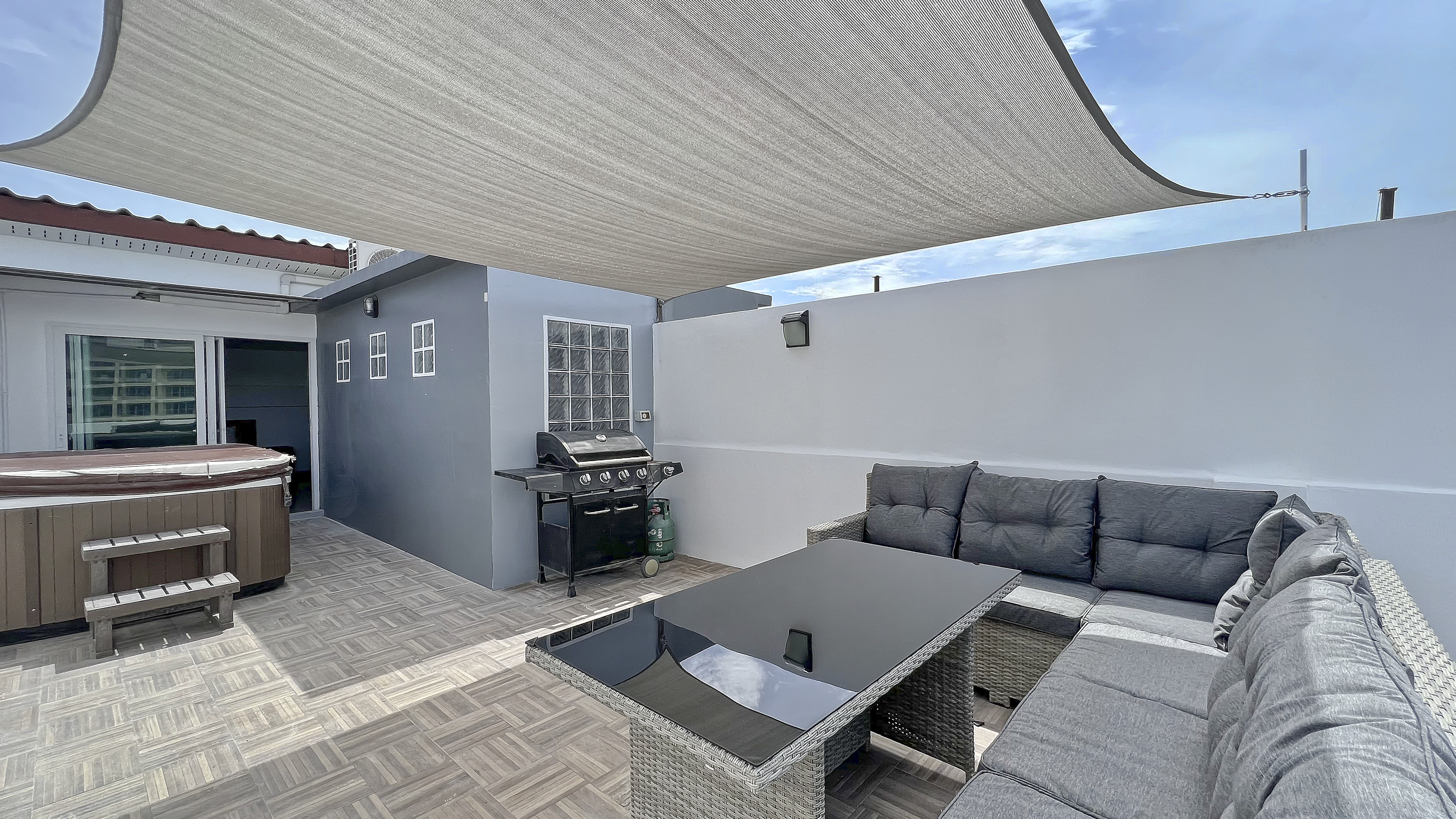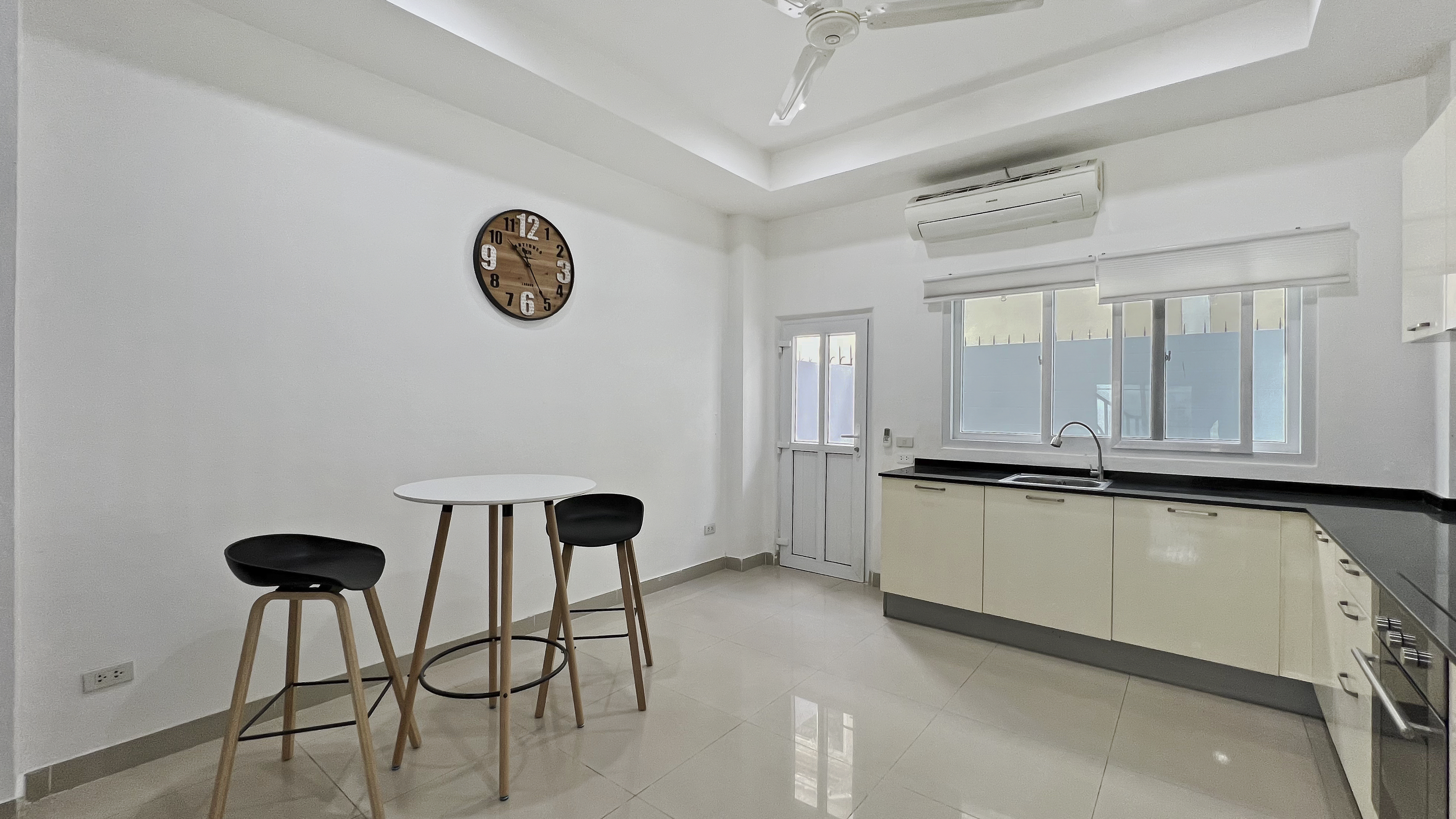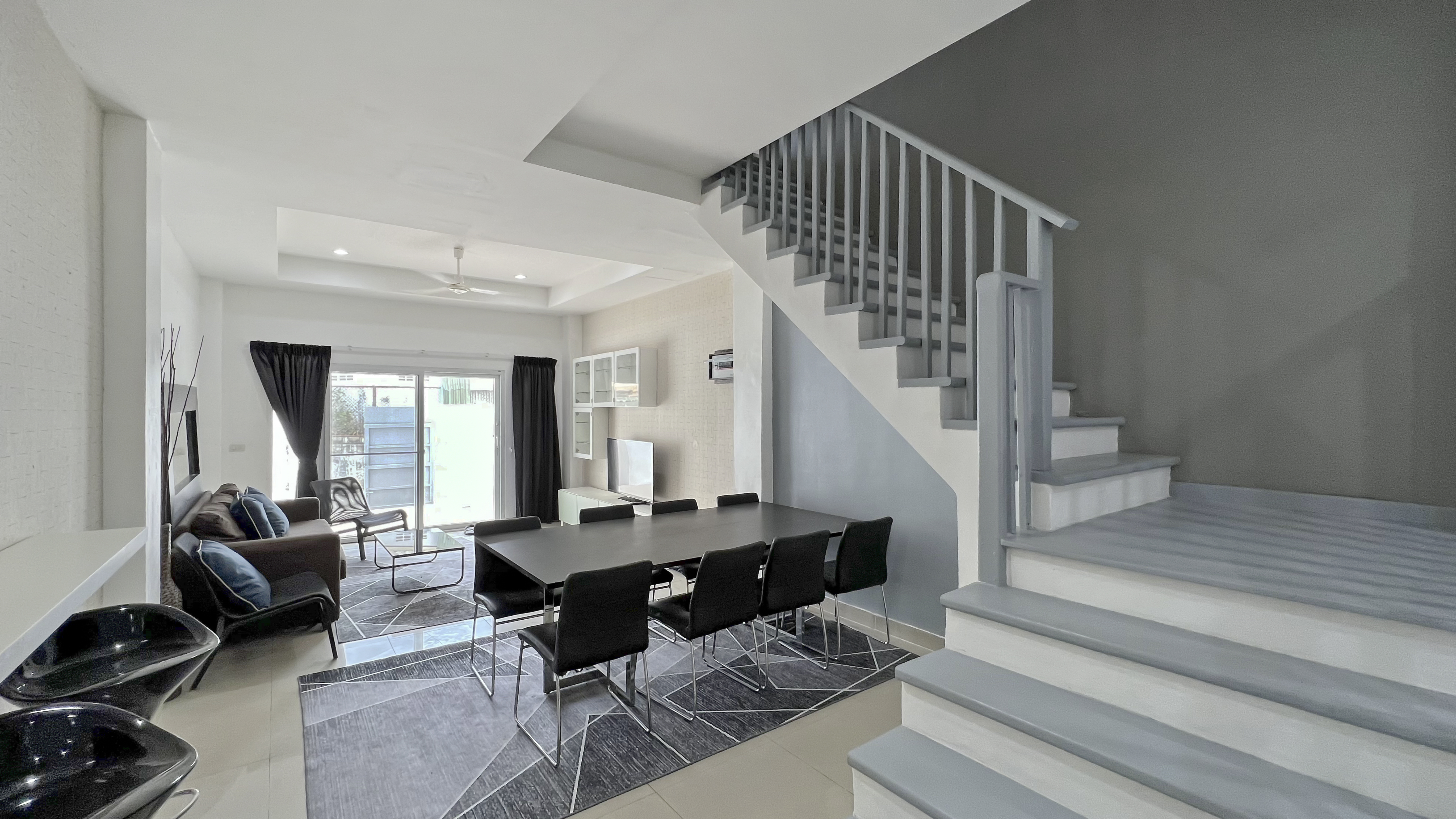 The very nice 4-bedroom townhouse is for rent just off Threppresit Road in Jomtien. On the ground floor, you have a lounge area and a nice kitchen with a large dining table. On the second floor, there is a pool table area and a bedroom. on the 3rd floor, you have 2 bedrooms and on the 4th floor, you have a 4th bedroom along with a rooftop terrace with BBQ and Jacuzzi.