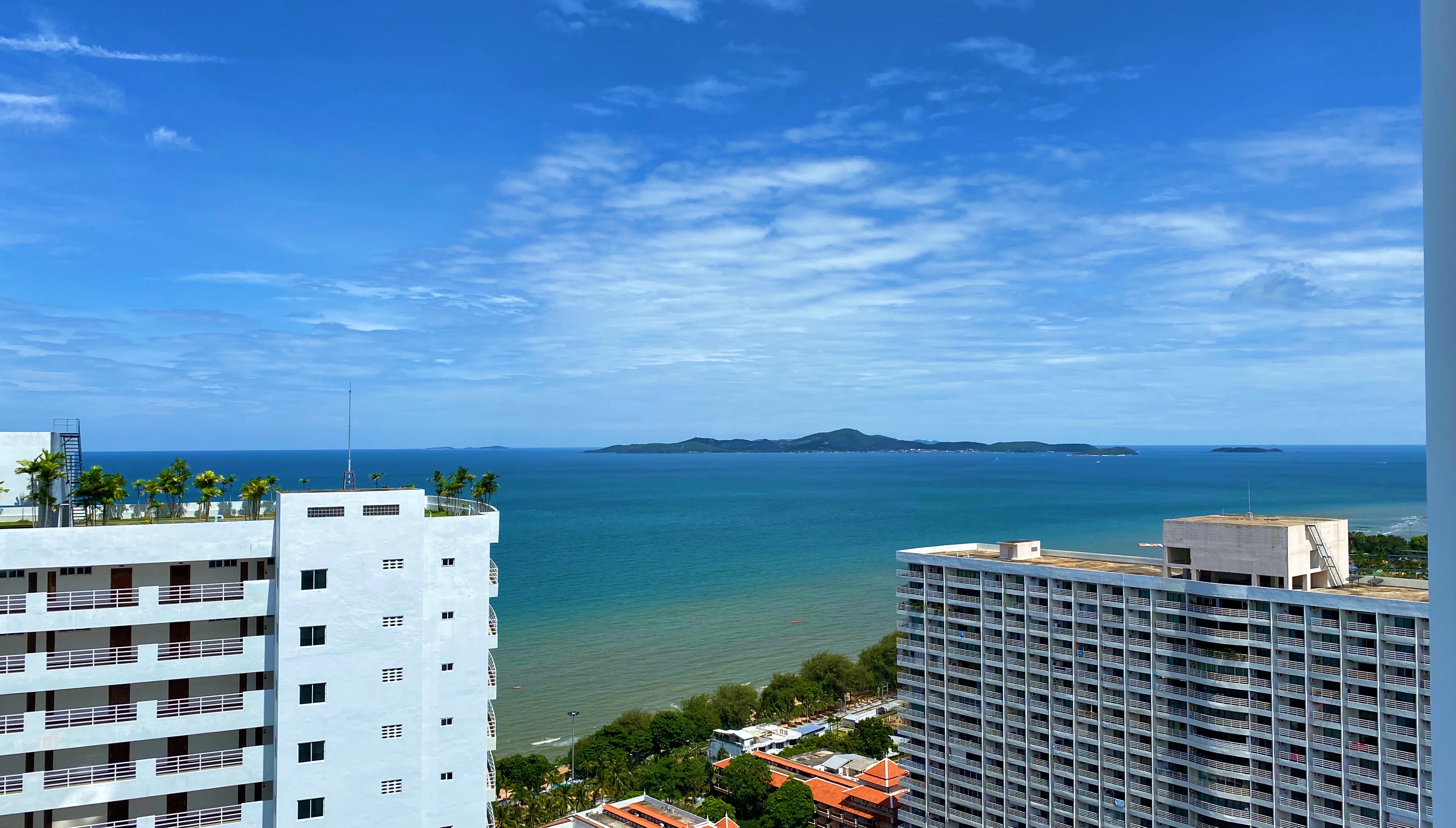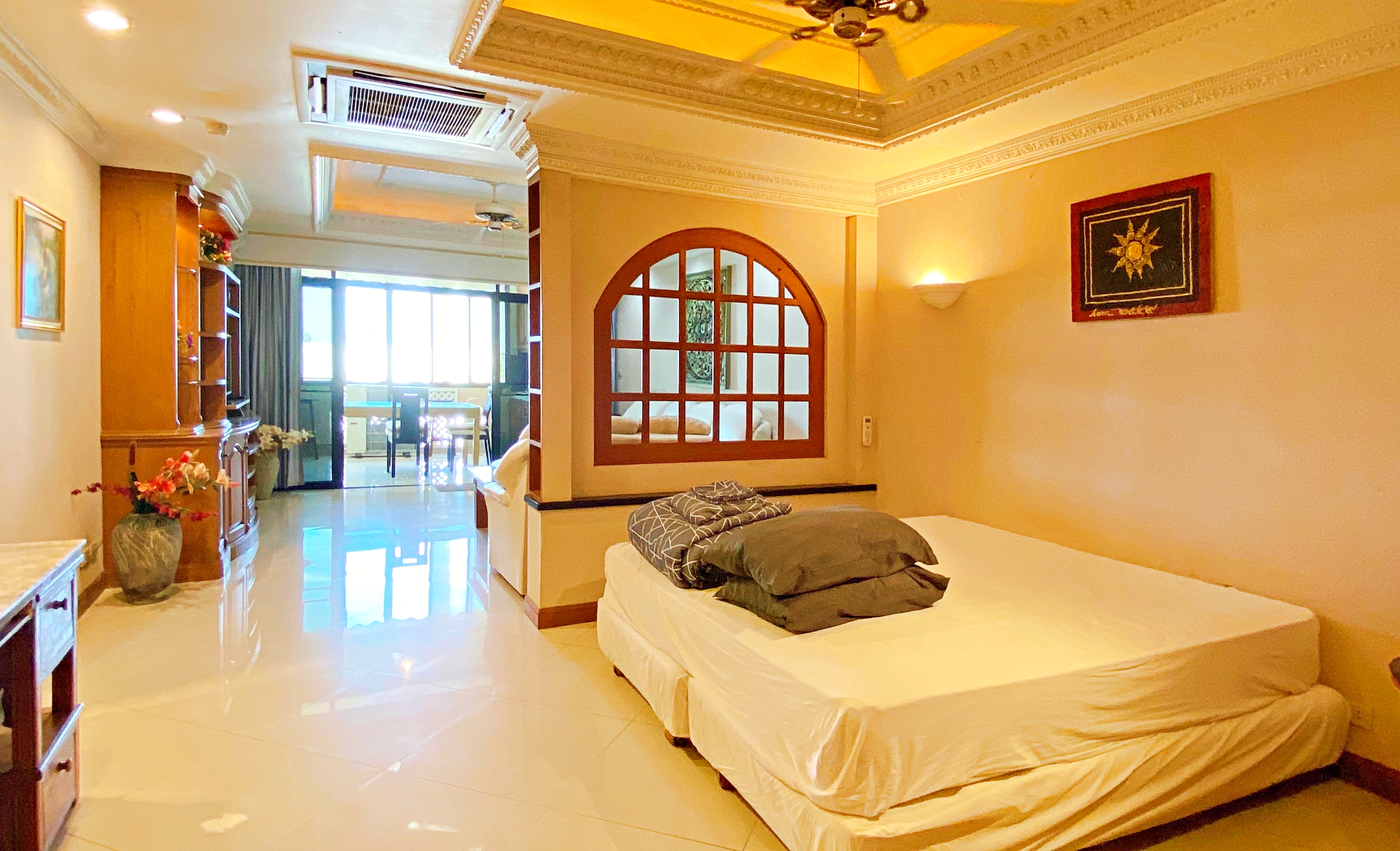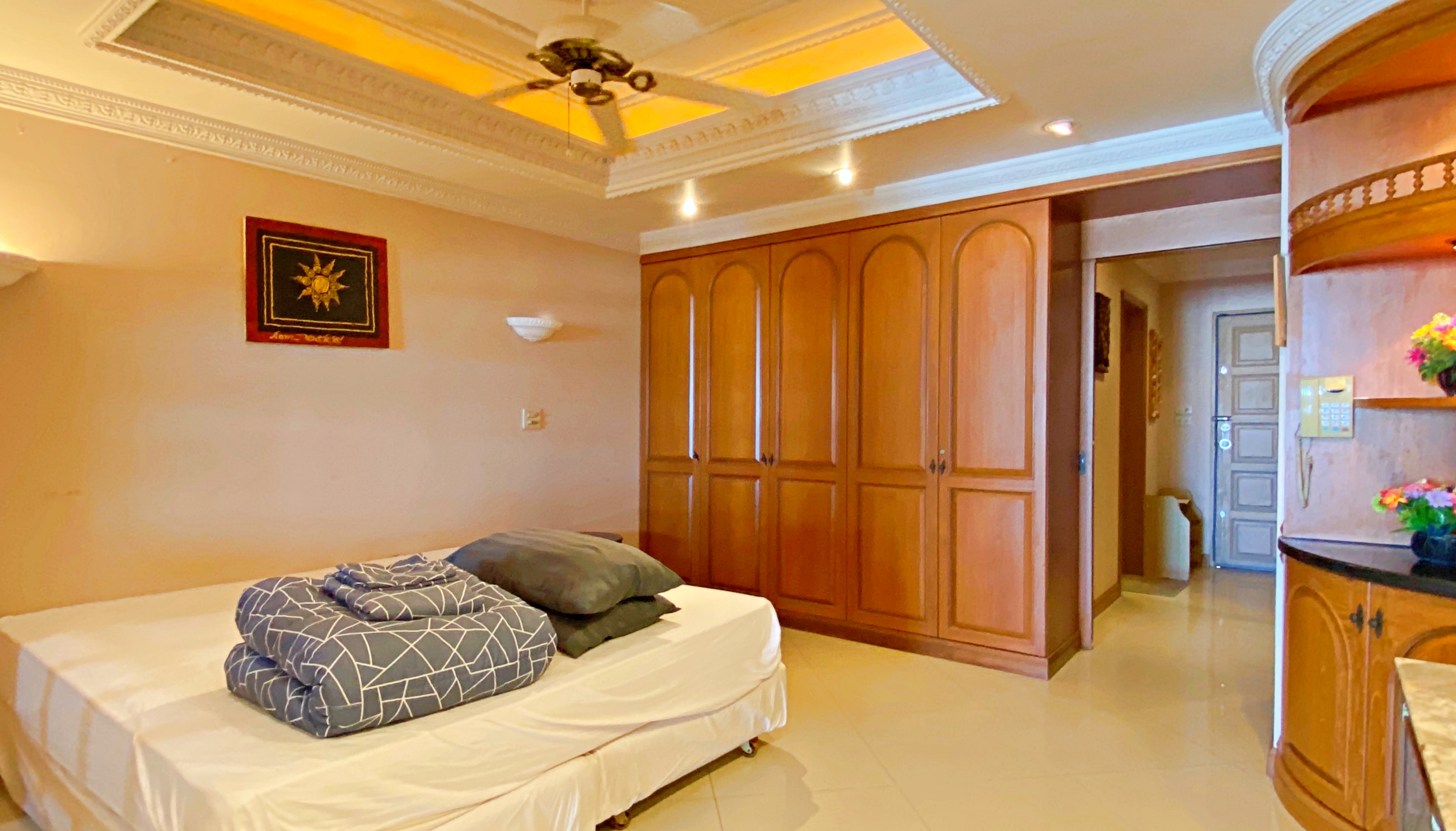 Large Studio for rent on a high floor in Jomtien Complex. This condo comes fully furnished and has a separate living and sleeping area. There is a spacious separate kitchen with a dining table from where you can enjoy the views of Koh Larn island.