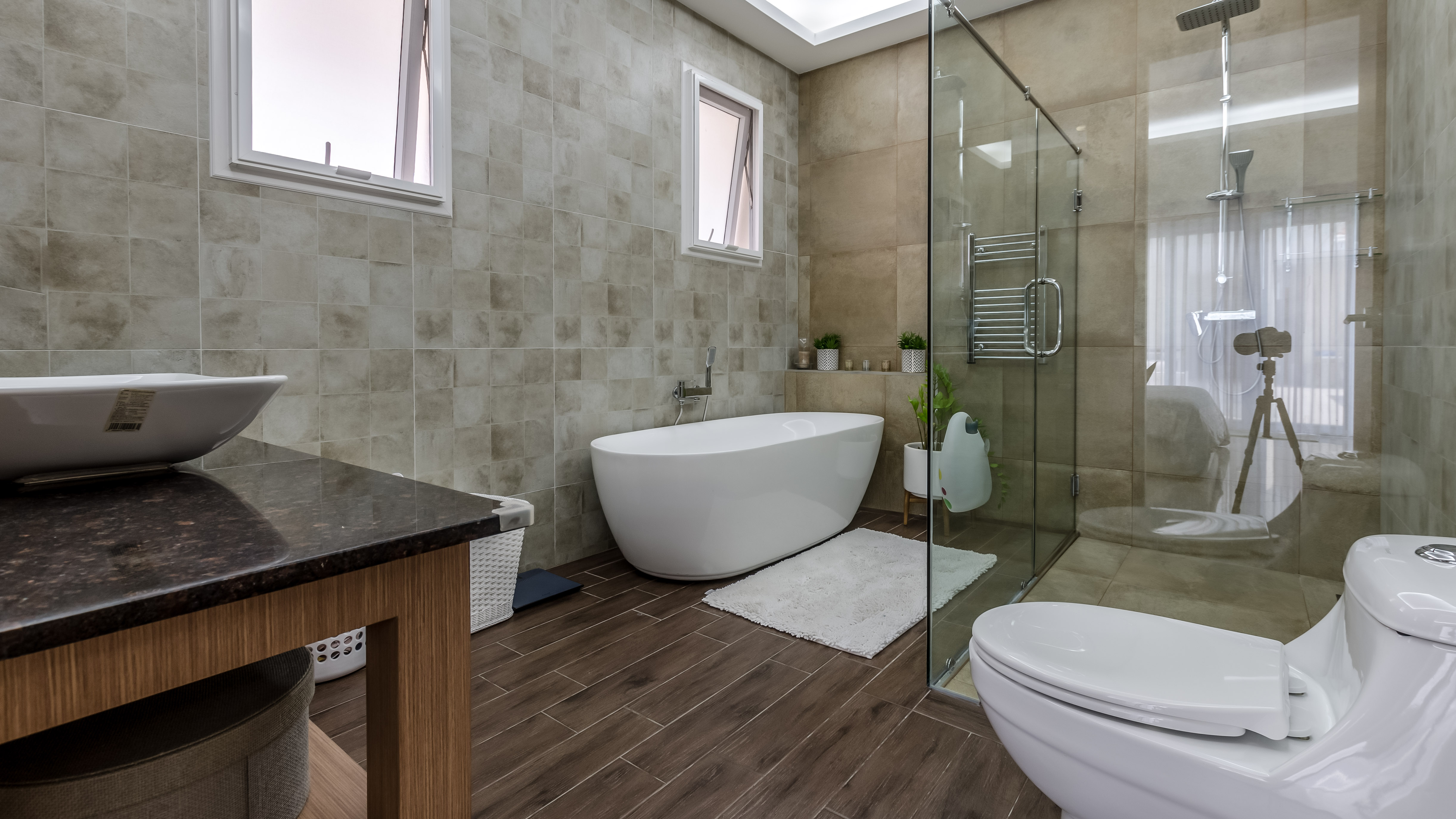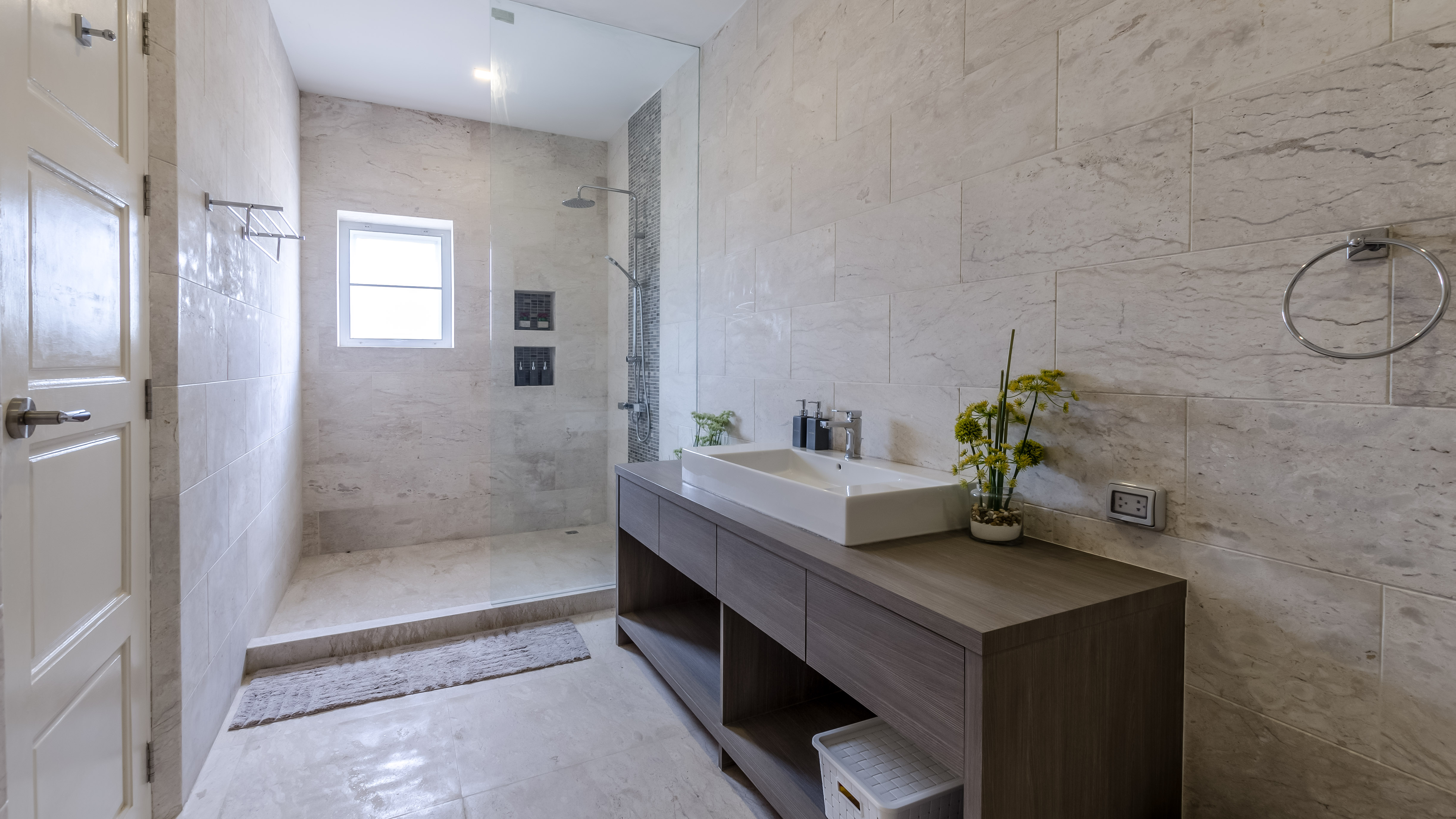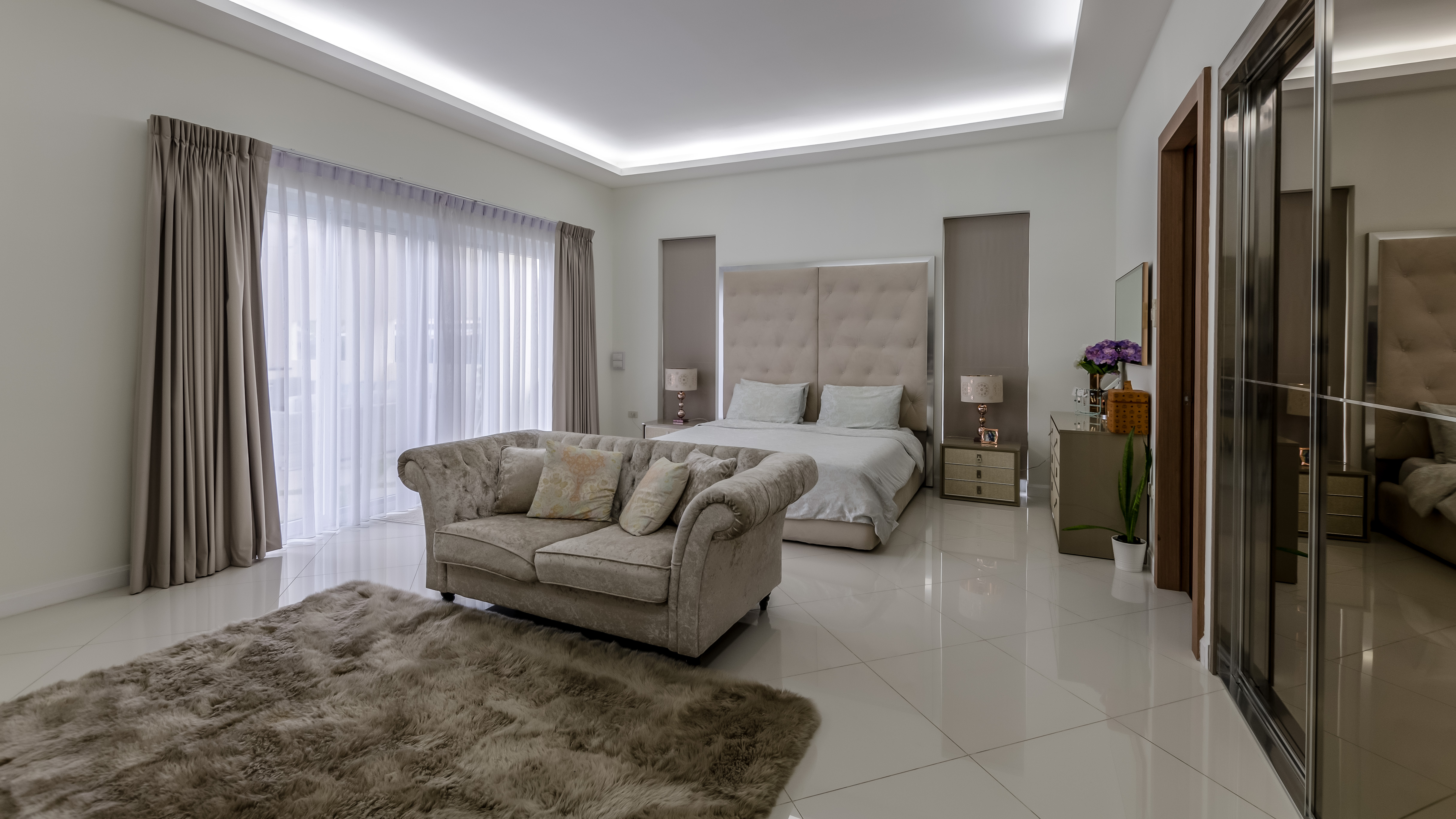 The master bedroom and two of the guest bedrooms have walk-in closets. The master bathroom has a bathtub. All of the bedrooms and bathrooms are spacious and nicely finished.