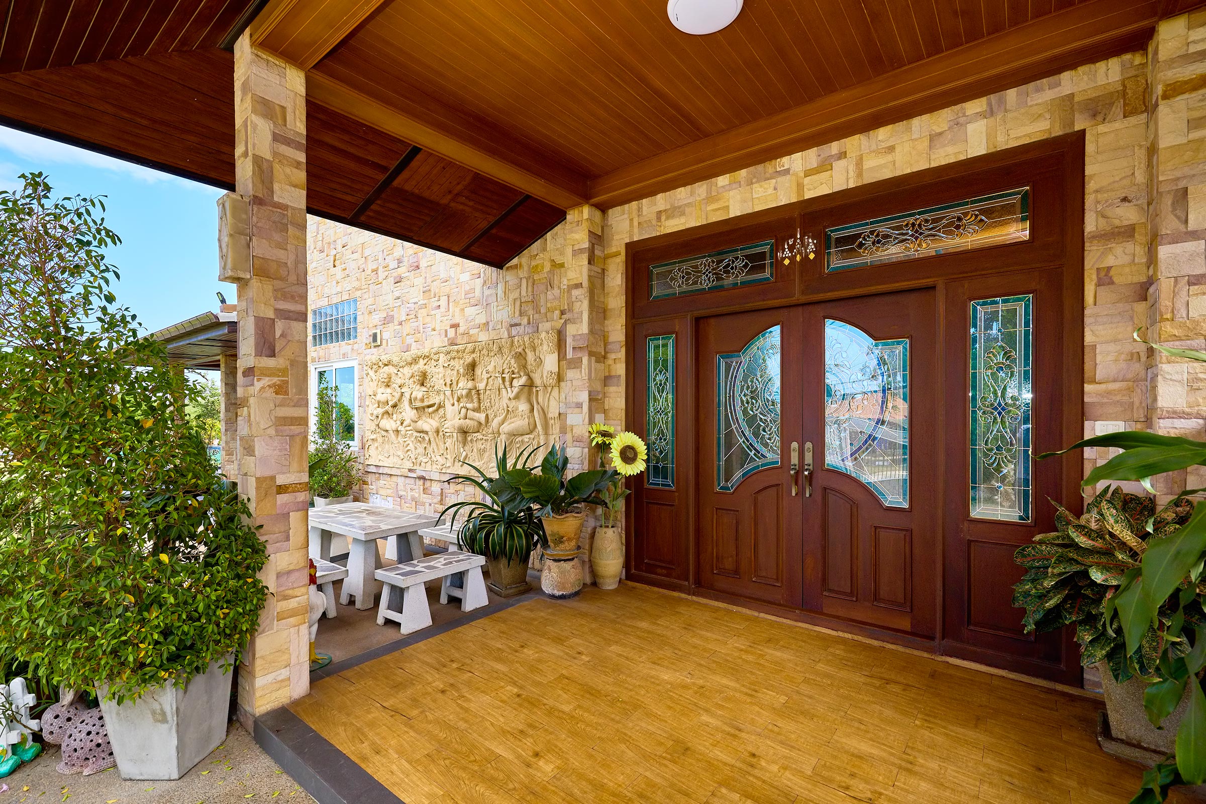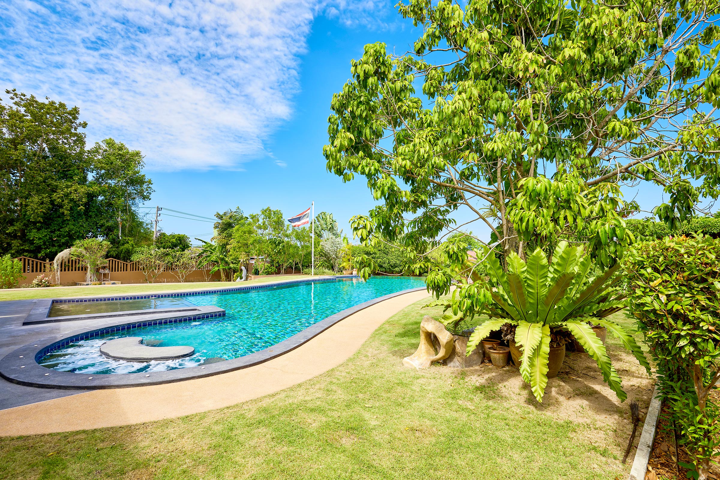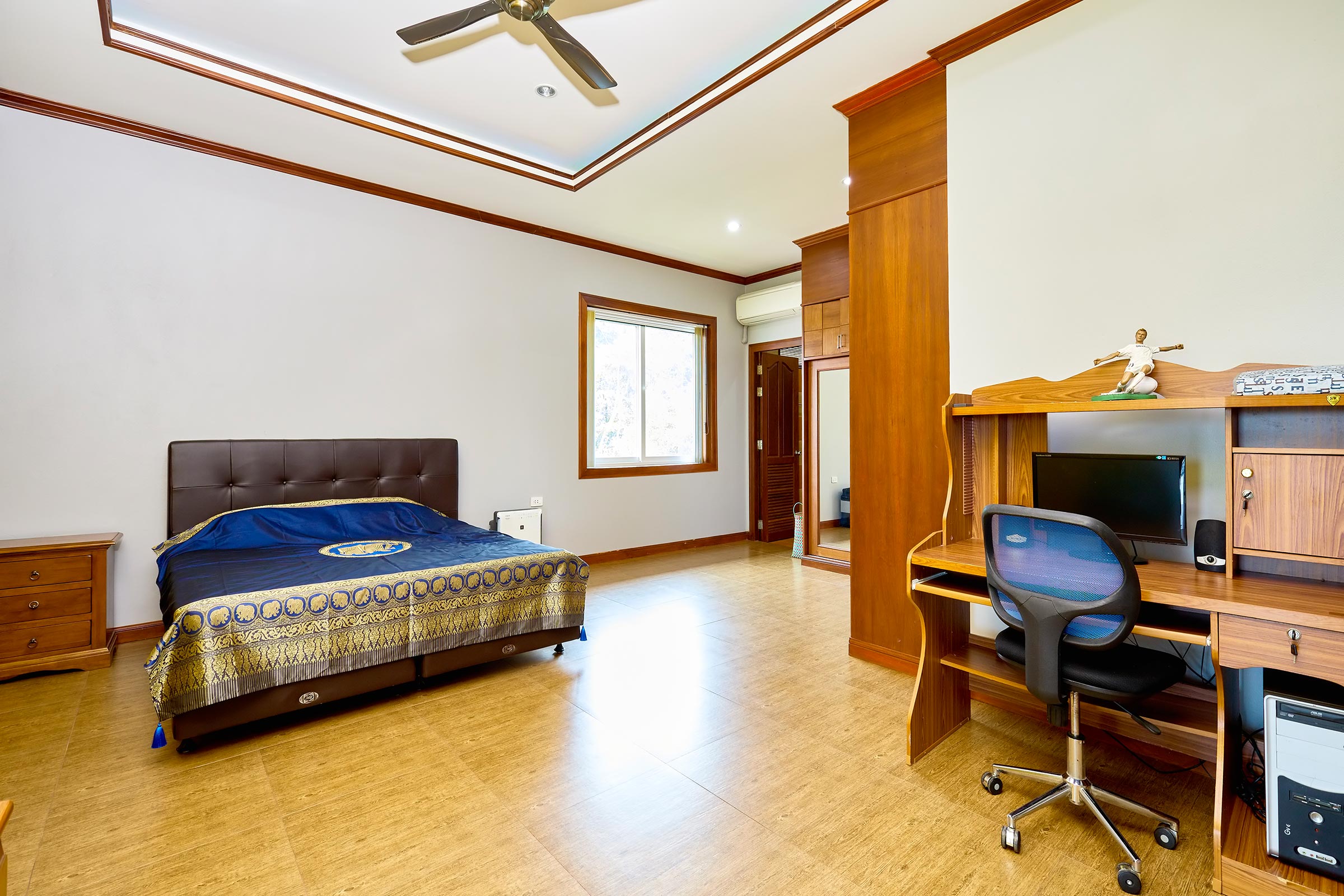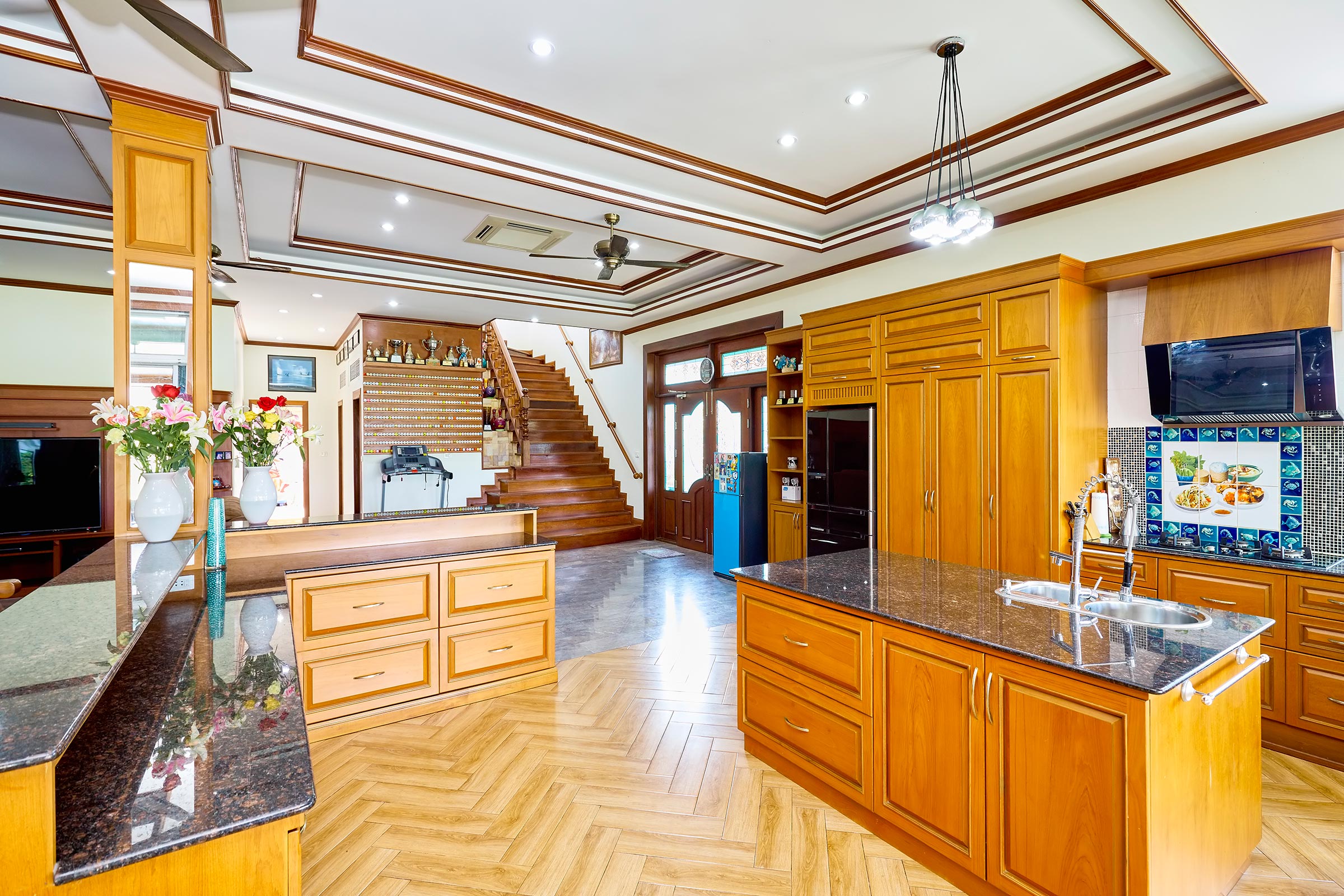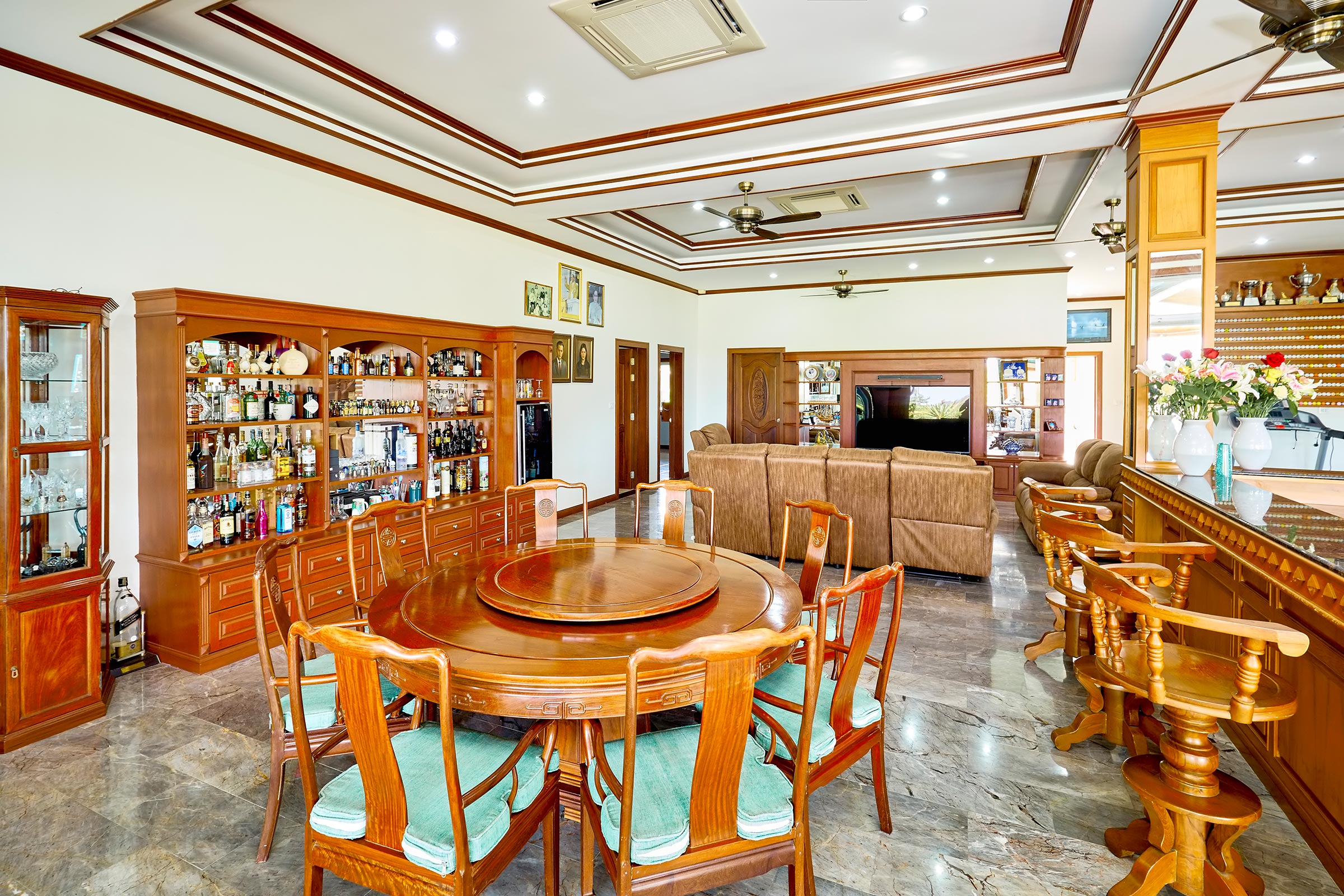 Huge 6-bedroom Pool Villa with a huge land plot for sale close to Mabprachan Lake in East Pattaya. This massive house has a very big living area of 780 sqm including 6 bedrooms which all are ensuite and 2 storage rooms. On the ground floor, you have a huge open plan custom-built kitchen, dining, and TV area along with 3 large bedrooms and 2 storage rooms. From the open plan living area, you access a massive 100 sqm covered patio and the pool and garden area.