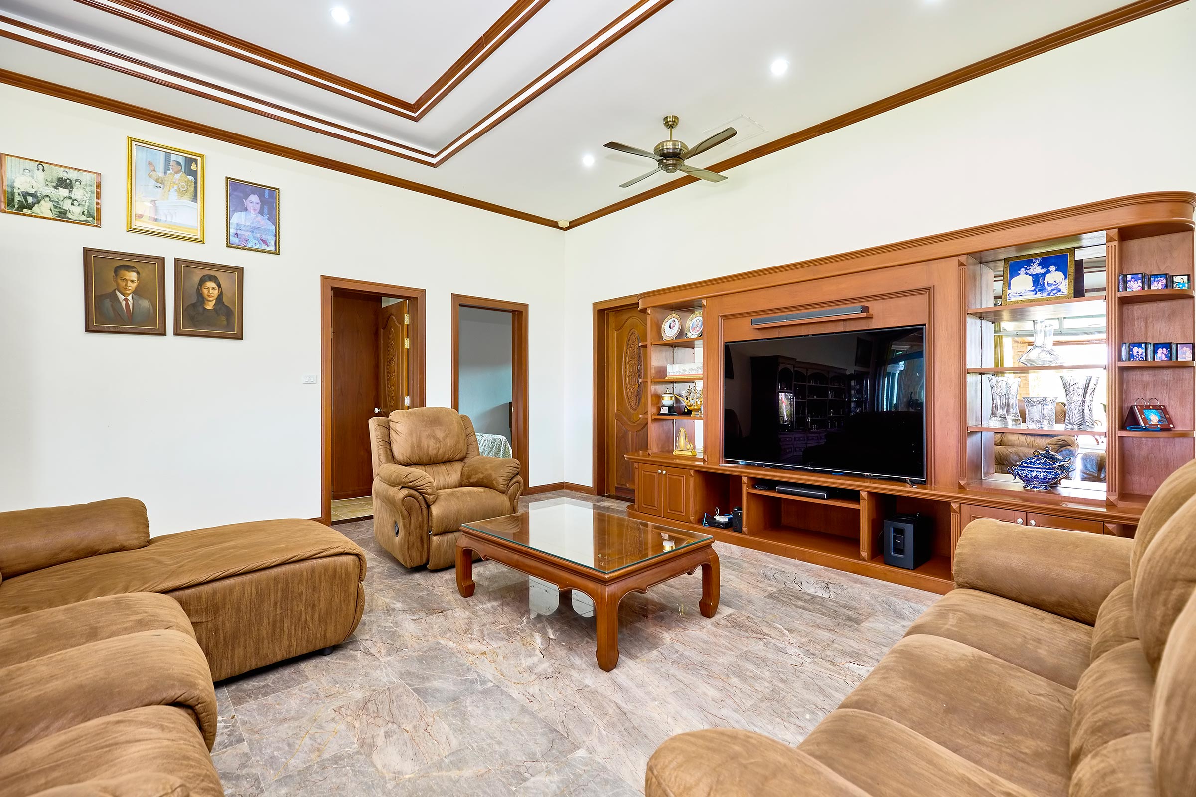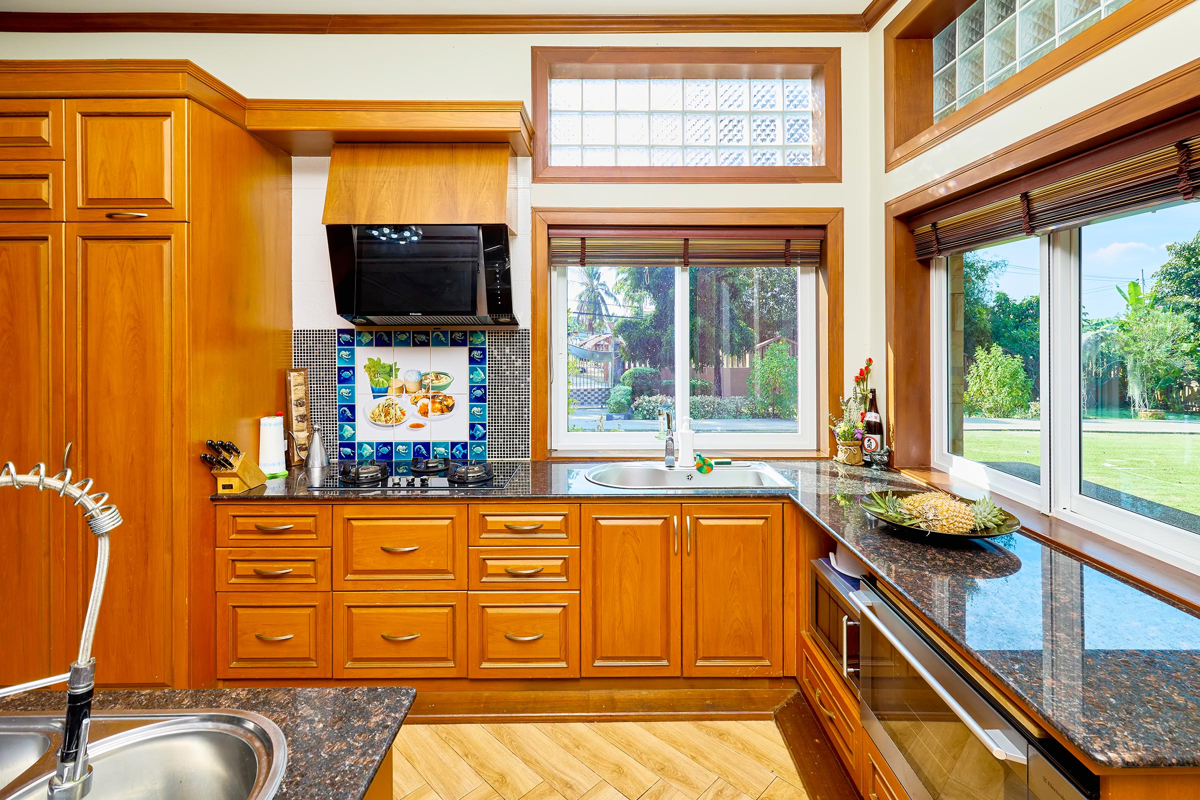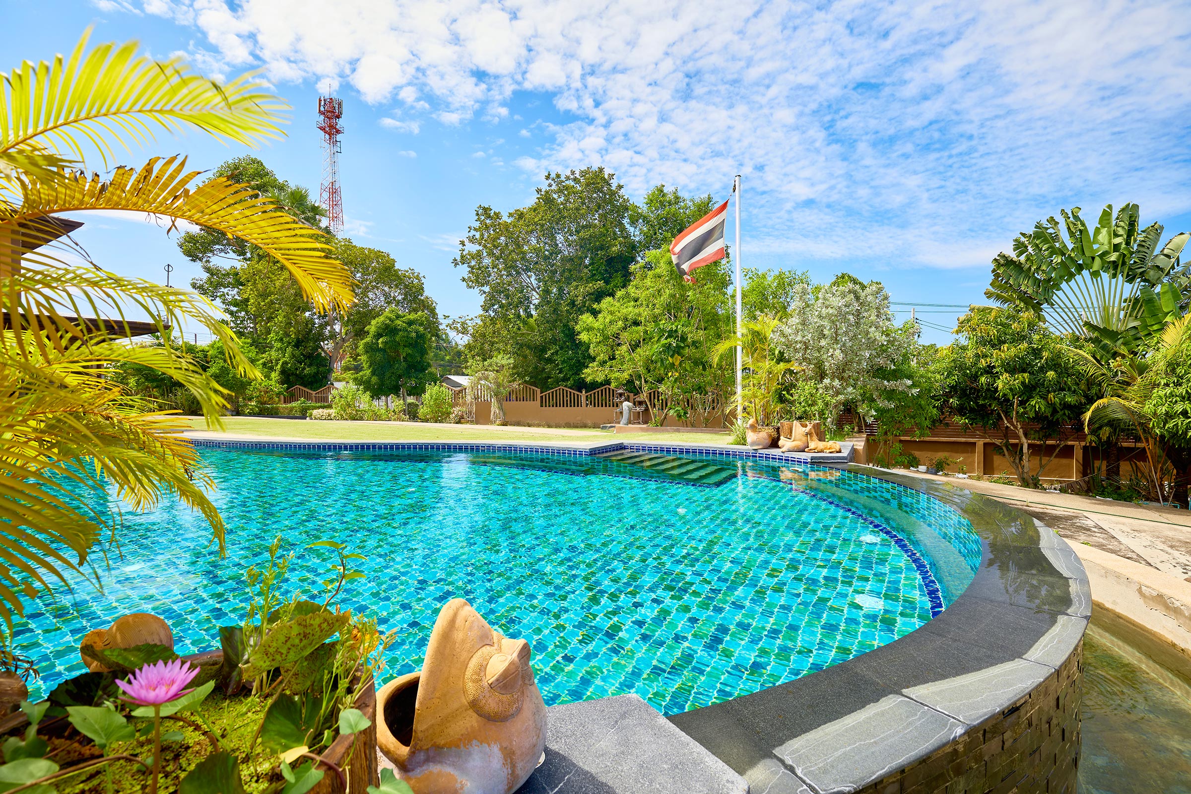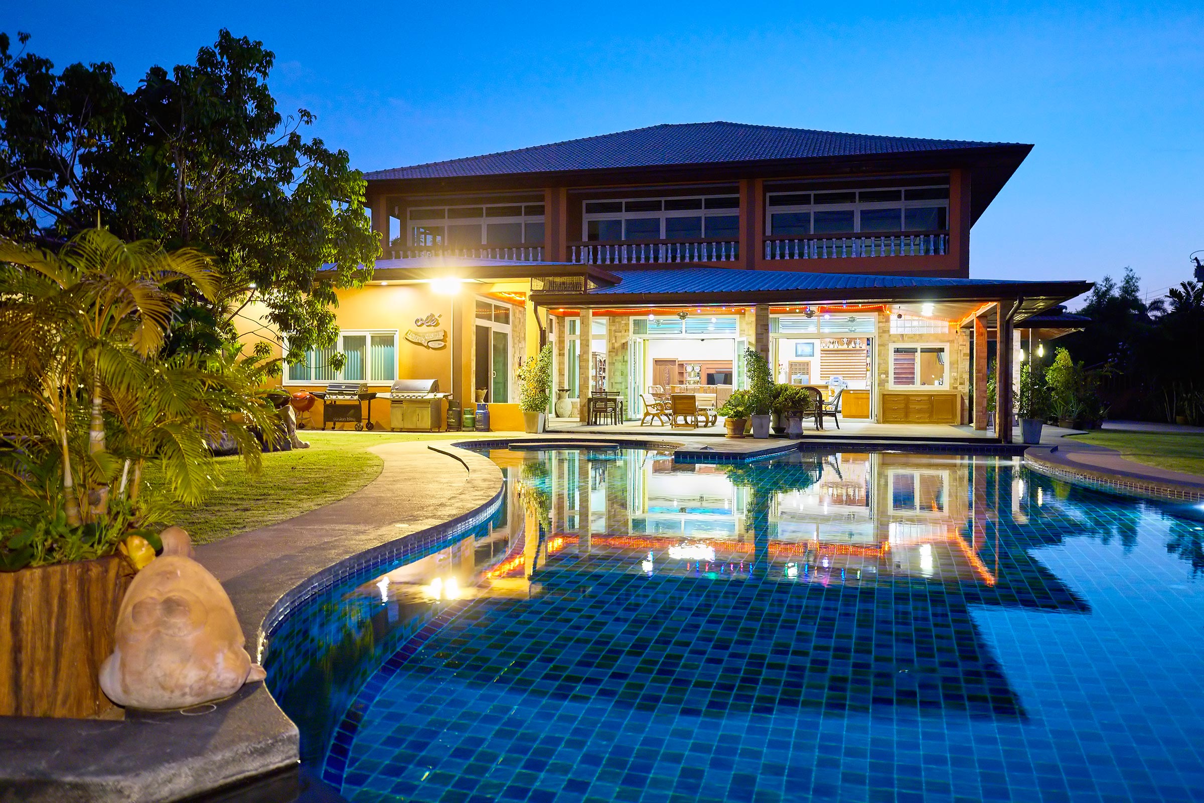 Huge 6-bedroom Pool Villa with a huge land plot for sale close to Mabprachan Lake in East Pattaya. This massive house has a very big living area of 780 sqm including 6 bedrooms which all are ensuite and 2 storage rooms. On the ground floor, you have a huge open plan custom-built kitchen, dining, and TV area along with 3 large bedrooms and 2 storage rooms. From the open plan living area, you access a massive 100 sqm covered patio and the pool and garden area.