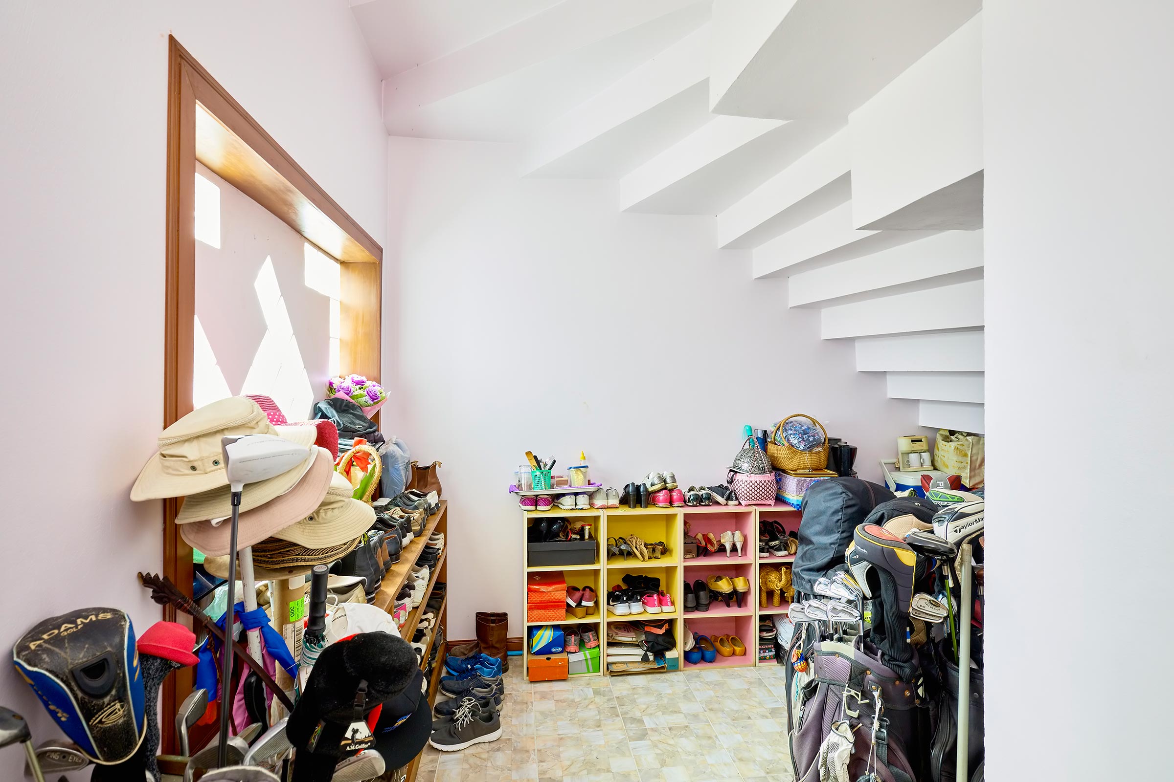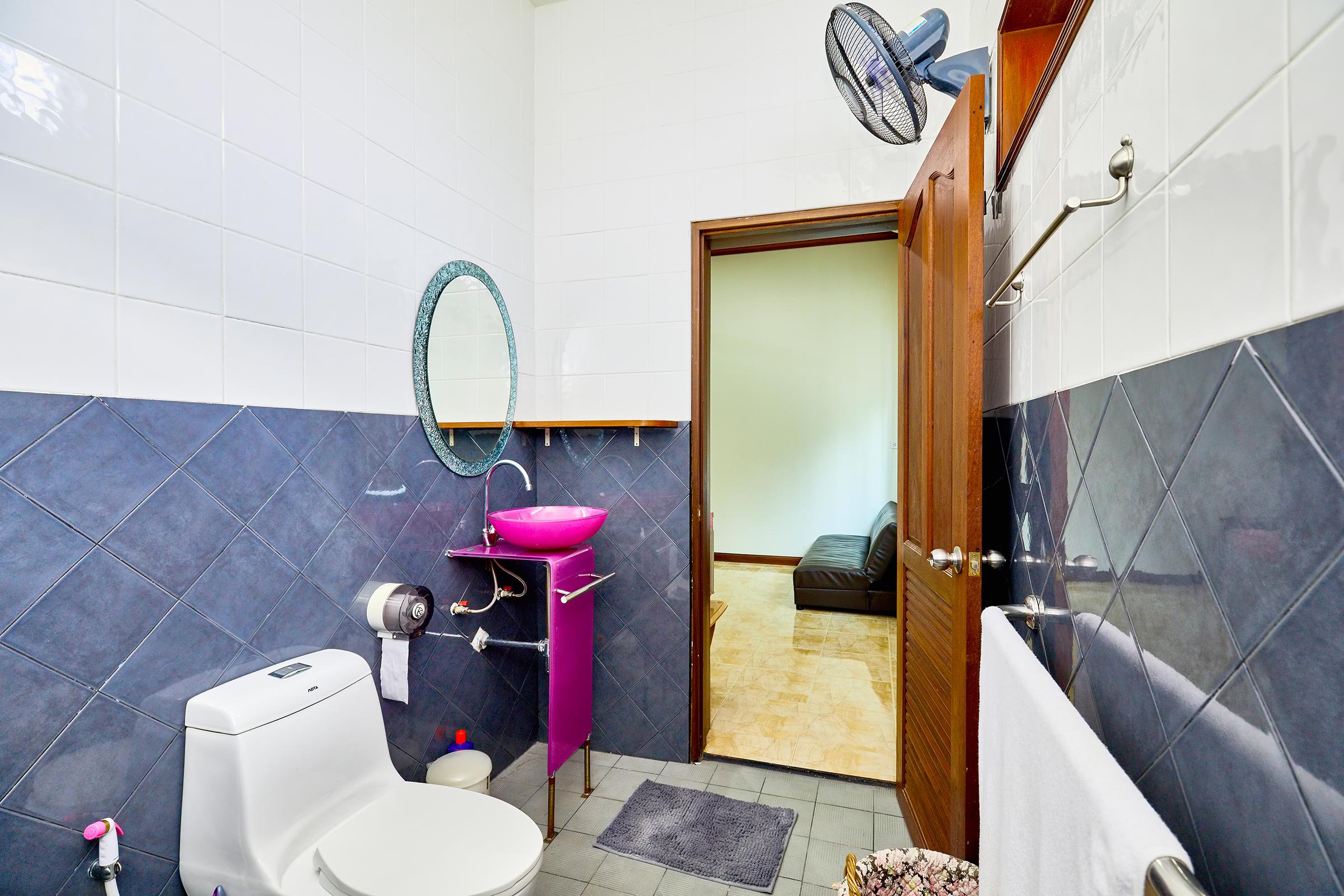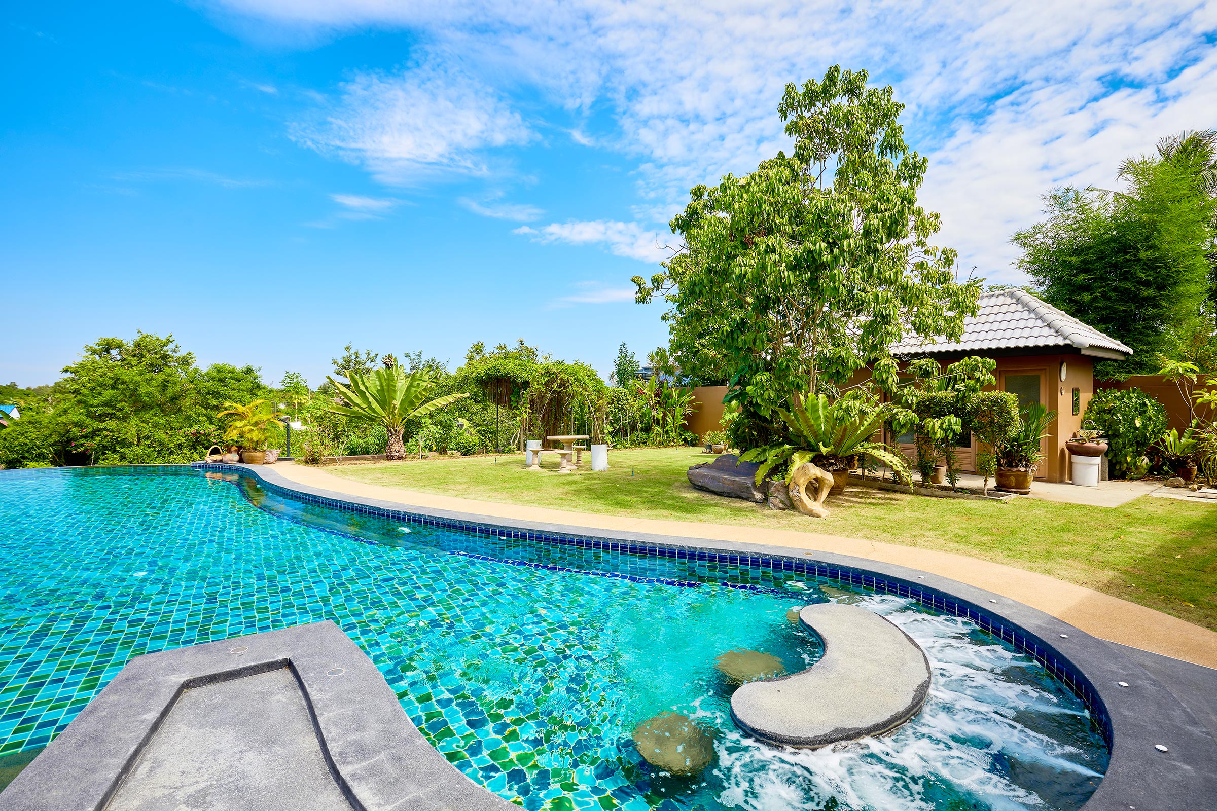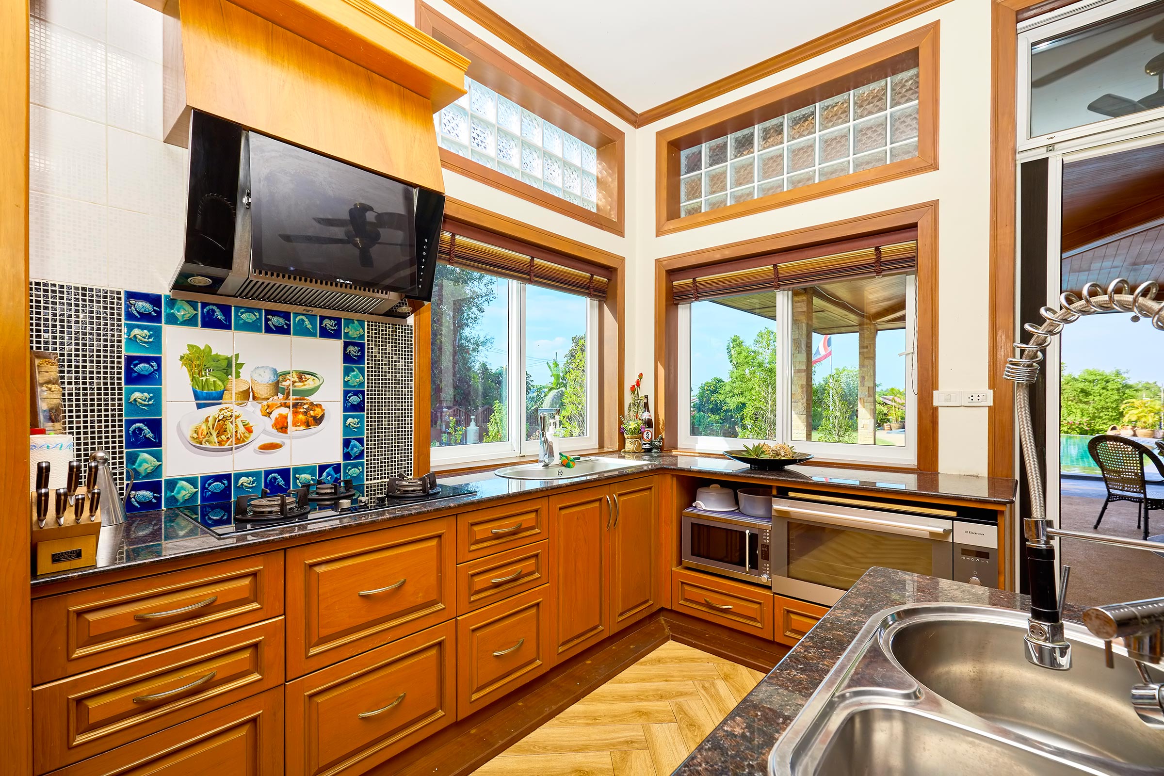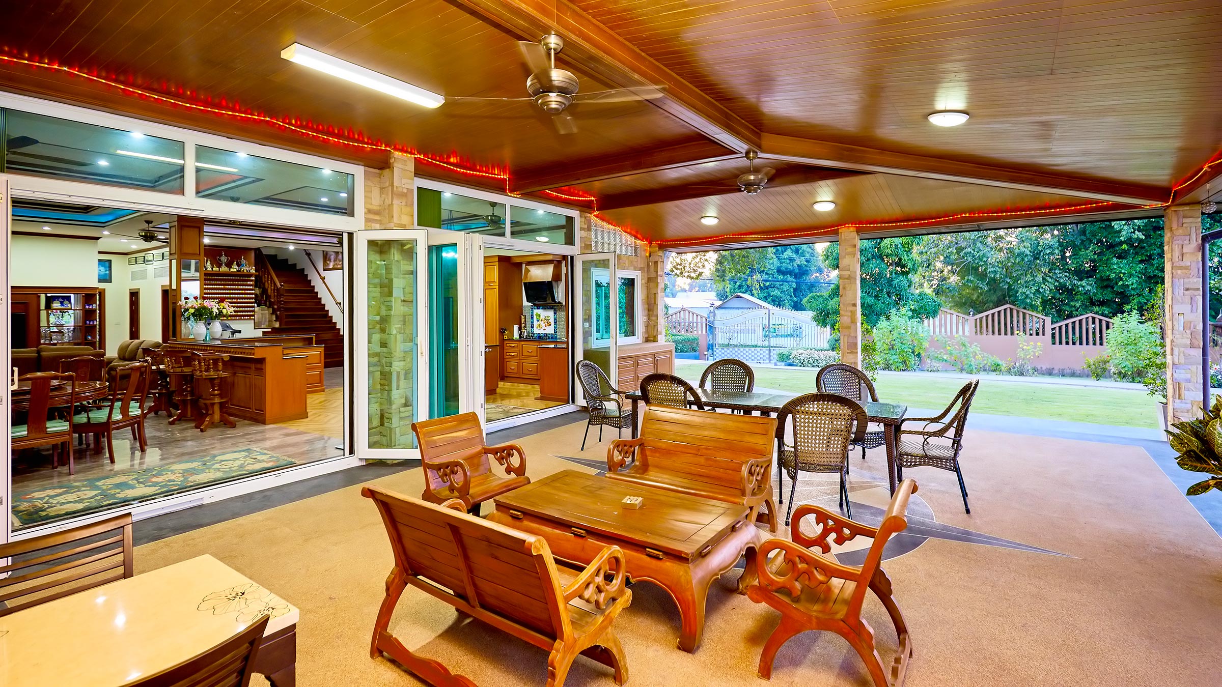 Huge 6-bedroom Pool Villa with a huge land plot for sale close to Mabprachan Lake in East Pattaya. This massive house has a very big living area of 780 sqm including 6 bedrooms which all are ensuite and 2 storage rooms. On the ground floor, you have a huge open plan custom-built kitchen, dining, and TV area along with 3 large bedrooms and 2 storage rooms. From the open plan living area, you access a massive 100 sqm covered patio and the pool and garden area.
