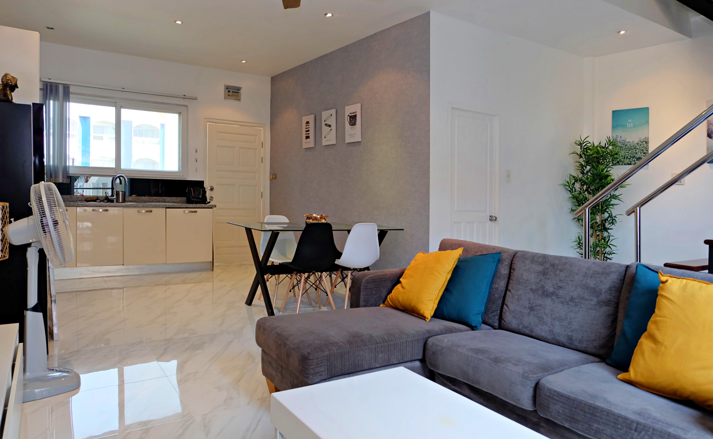 Beautiful 2-bedroom duplex condo for rent on Pratumnak Hill. This beautiful condo has just been renovated so everything is new. On the lower floor, you have a large European kitchen, dining, TV area, and a separate working area, as well as a large bathroom. On the second floor, you have 2 large bedrooms and a toilet. This large condo is offered for rent at only 18,000 baht per month long term.