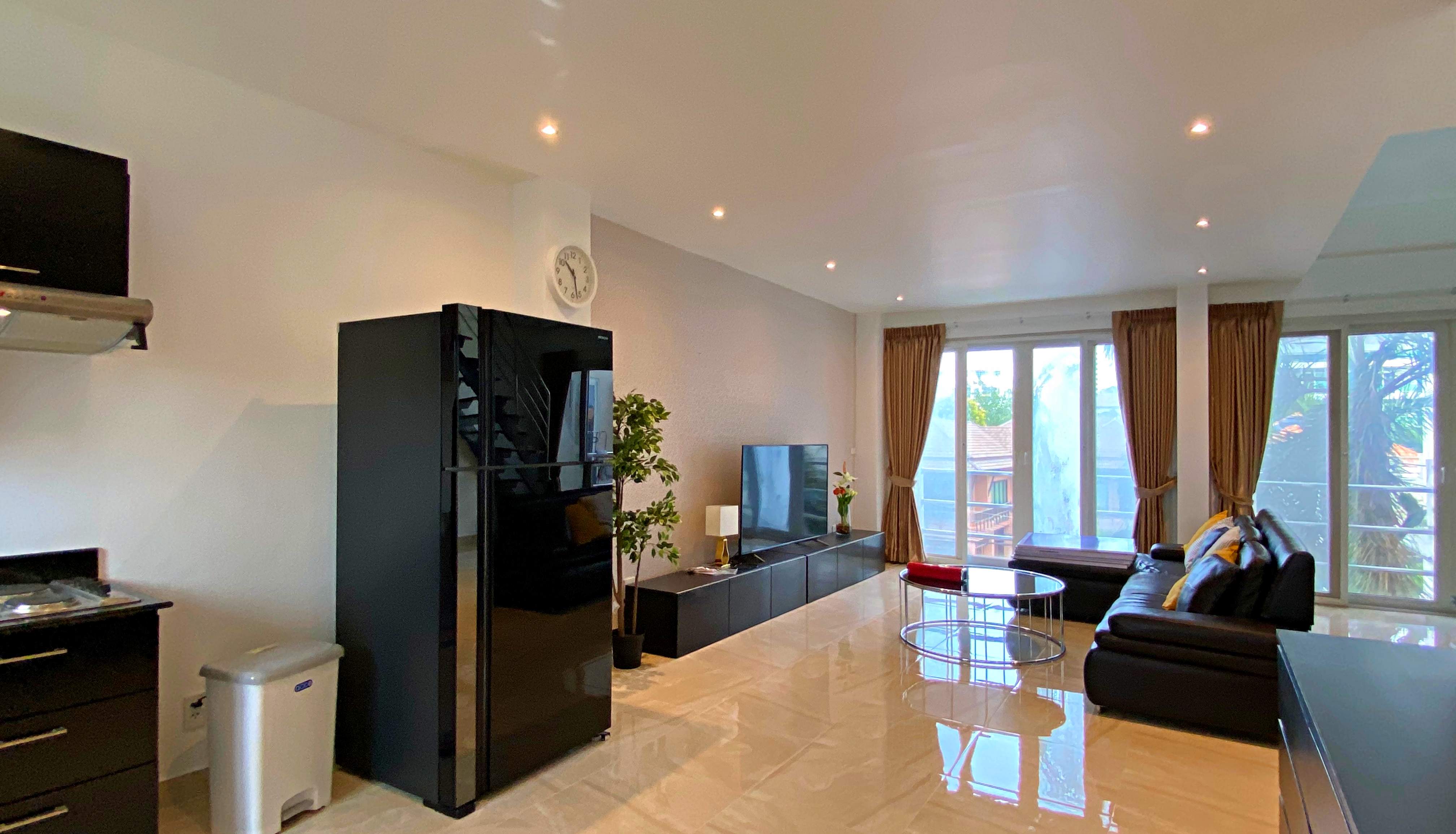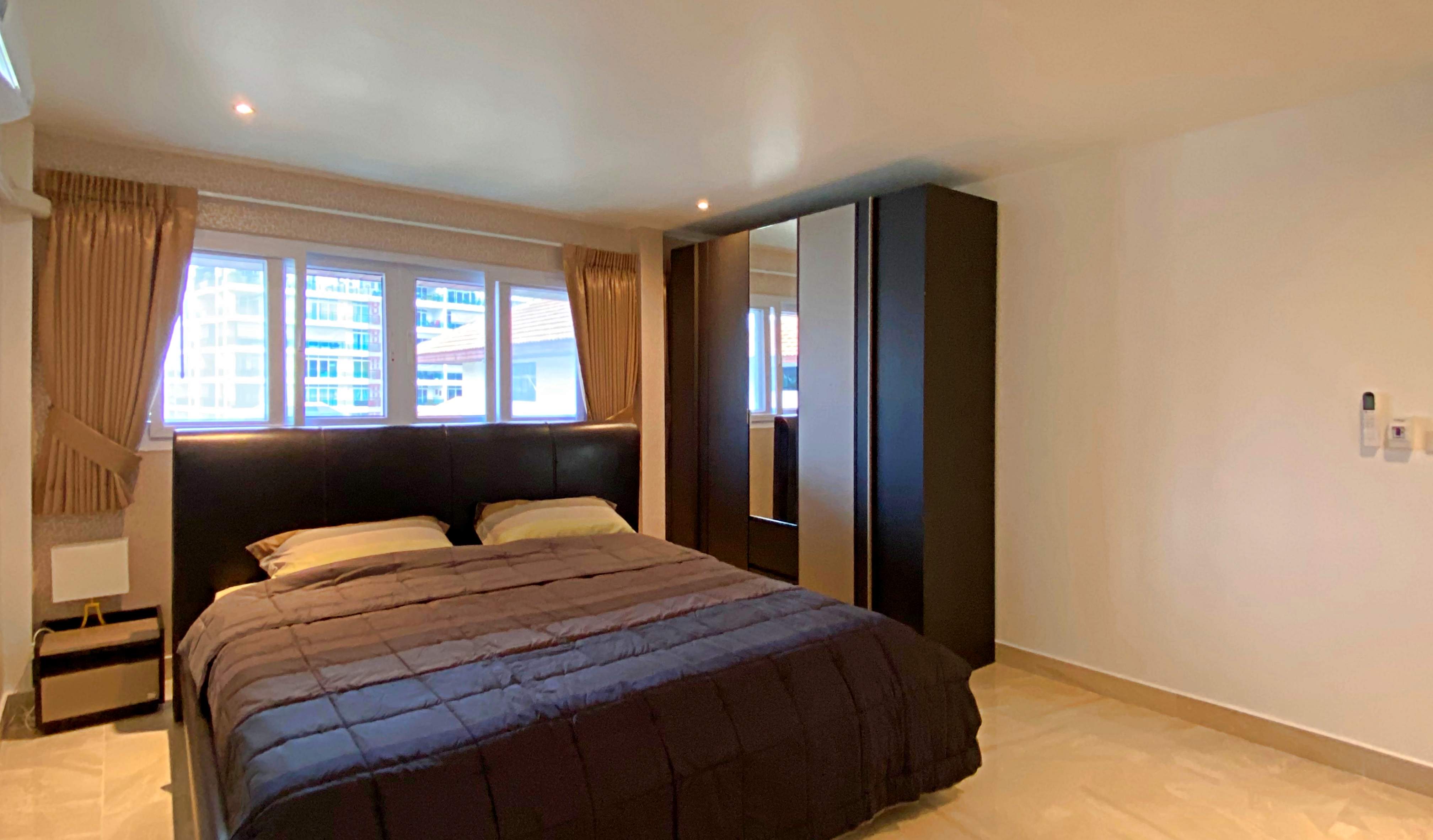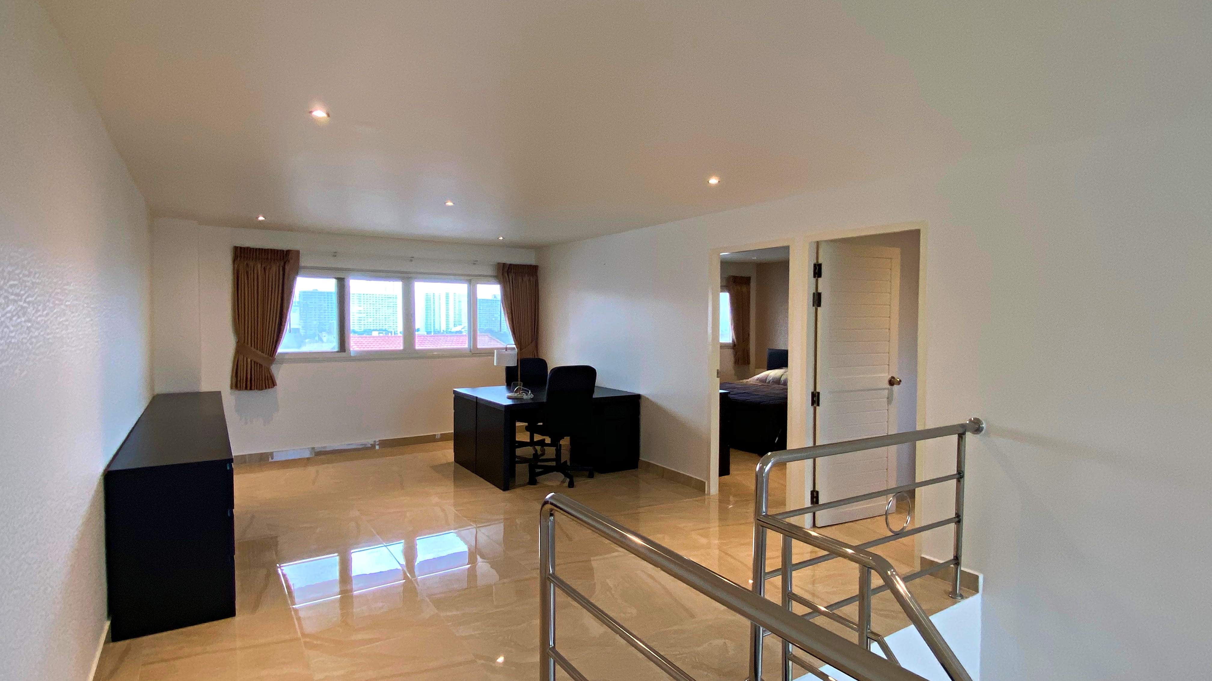 Just renovated duplex condo for rent on Pratumnak Hill. This 120 square meter condo has just been nicely renovated. On the lower floor, you have a large European kitchen, a dining and TV area, and a bathroom. On the second floor, you have 2 large bedrooms and an open area that is used as an office area.
