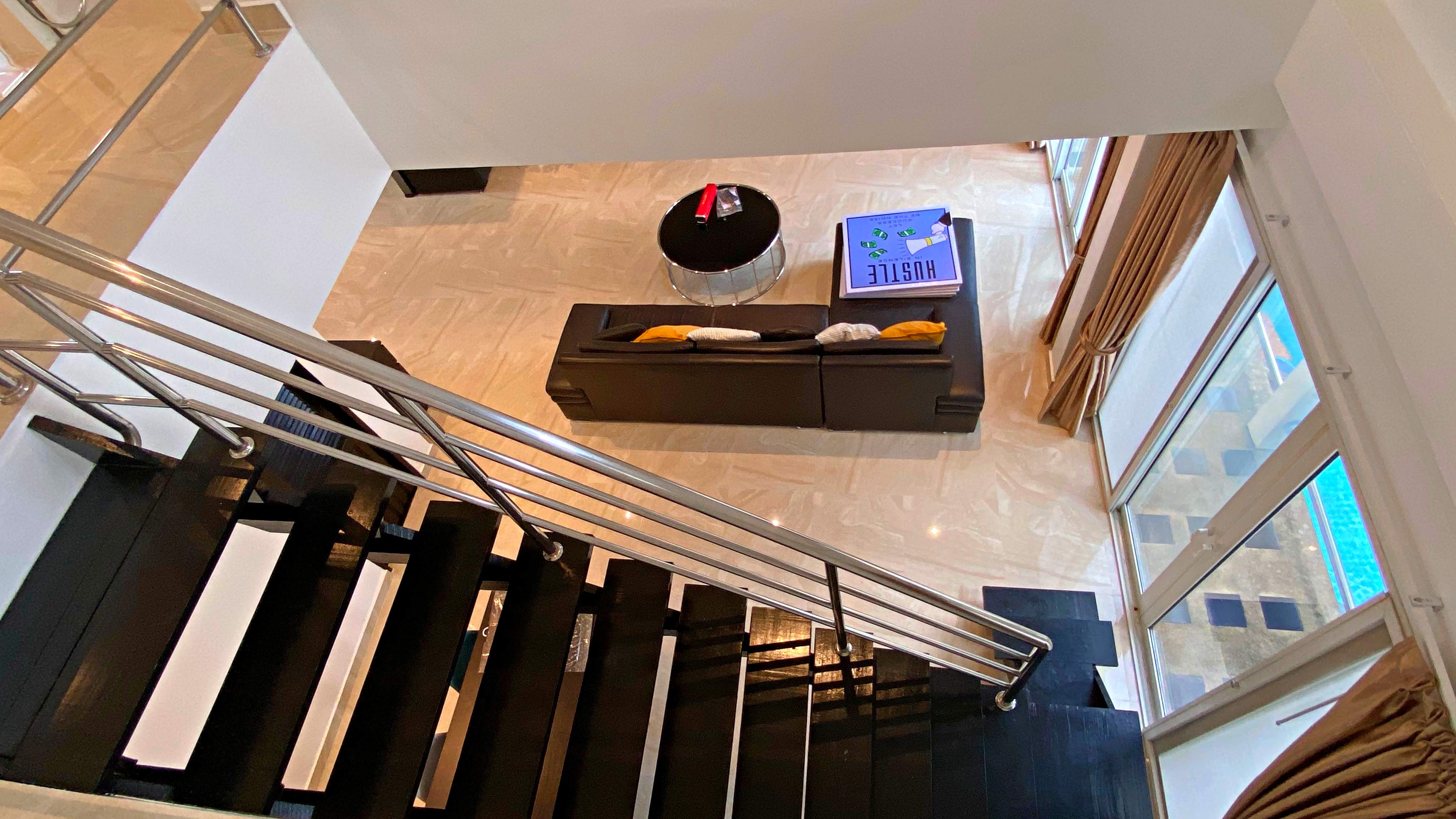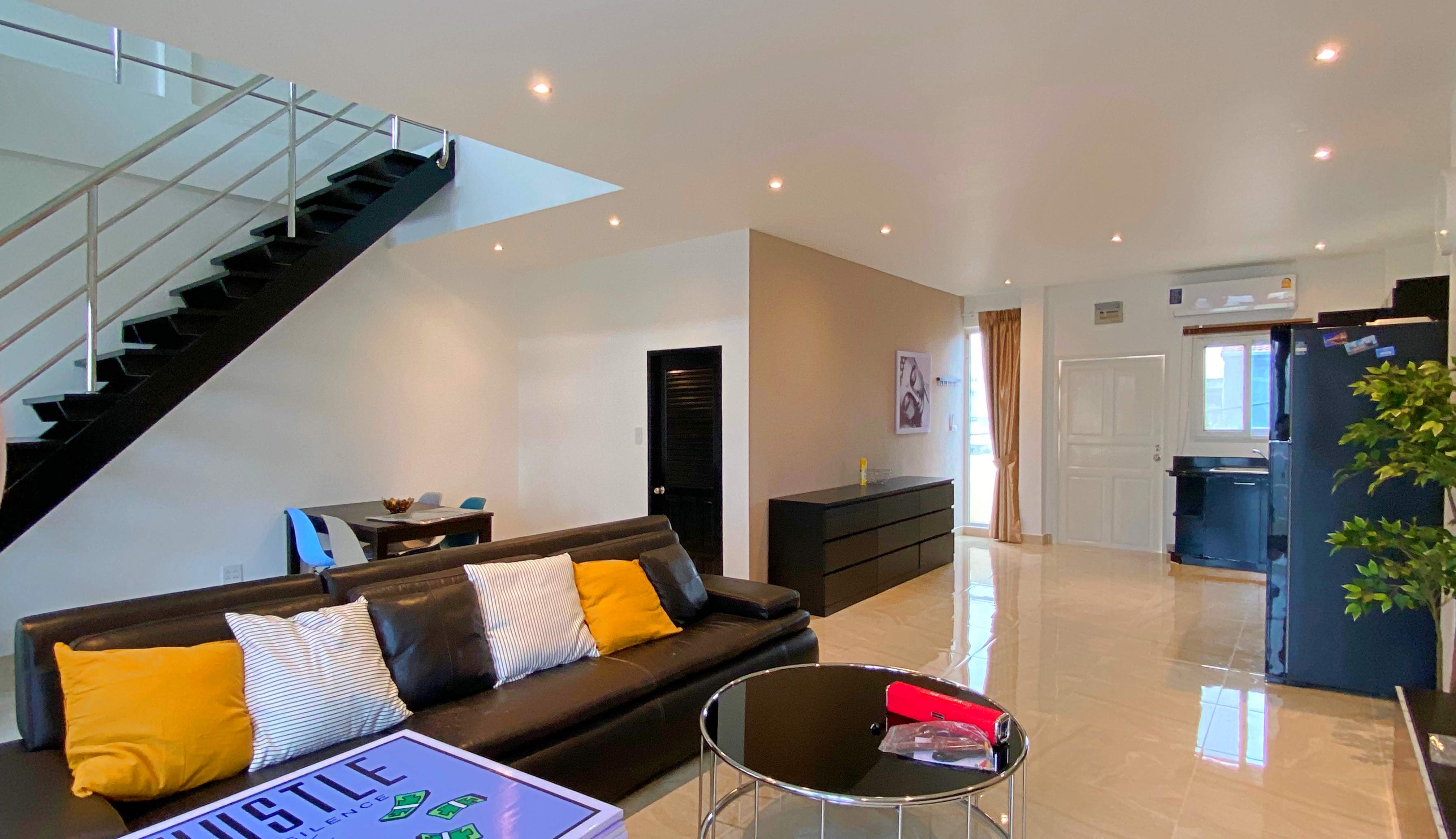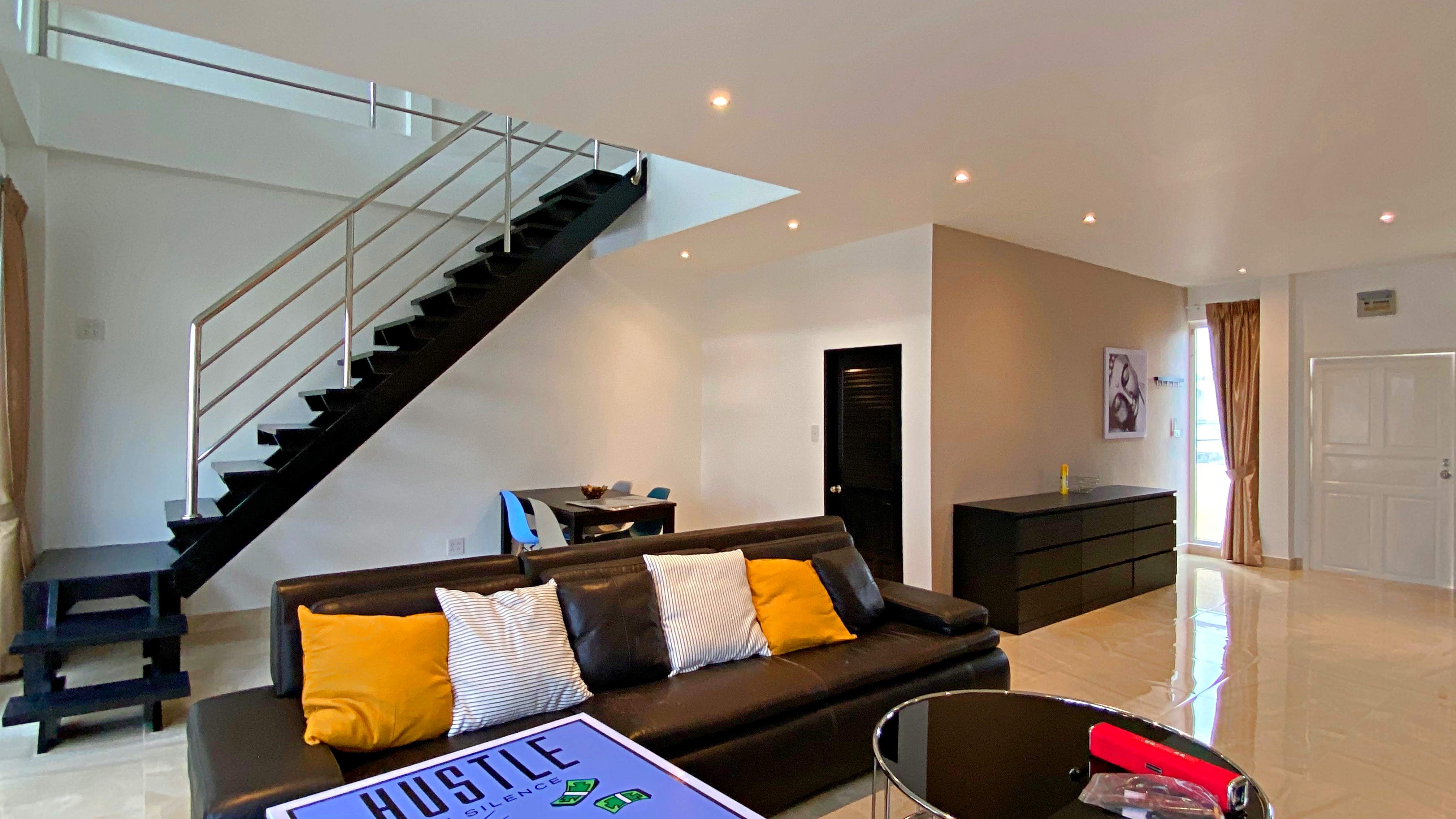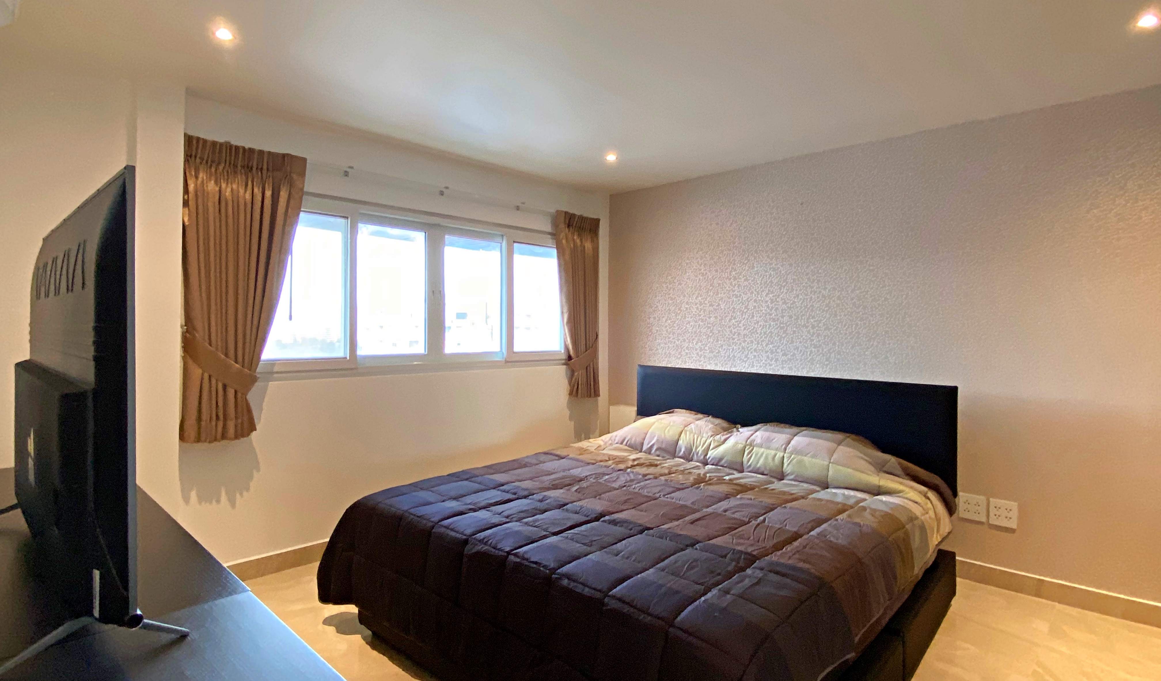 Just renovated duplex condo for rent on Pratumnak Hill. This 120 square meter condo has just been nicely renovated. On the lower floor, you have a large European kitchen, a dining and TV area, and a bathroom. On the second floor, you have 2 large bedrooms and an open area that is used as an office area.